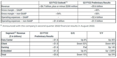 La subida de ventas del sector de los centros de datos no compensa la caída en esta ocasión. Será un aumento del 45 % interanual pero solo de un 8 % intertrimestral. La cifra de negocio de sistemas empotrador se ha visto inflada por la compra de Xilinx, y de ahí el fuerte aumento de ingresos. La división de juegos, que incluye las GPU de la compañía y los SoC de consolas, ha visto aumentar sus ingresos un 14 % respecto al T2 2021. Son datos provisionales, pero los definitivos que dé en noviembre no variarán mucho.