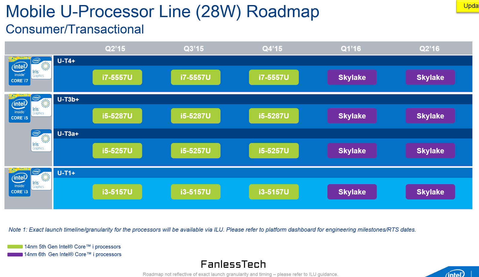 Buenas y malas noticias. Intel está preparando el lanzamiento de los procesadores de ultra bajo consumo Skylake-U apenas 8 meses después de la presentación de los Broadwell-U. Las buenas noticias es que al menos quedan cuatro meses para que lleguen en los primeros portátiles y tabletas como la Surface Pro o los MacBook Air, ya que los pondrá a la venta a principios de 2016.