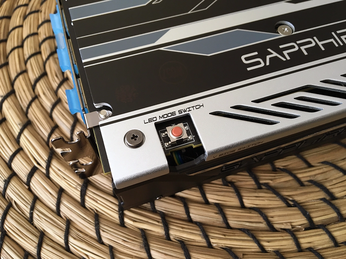Cuenta con un sistema de ventilación de dos ventiladores, que están envueltos en un armazón abierto por ambos lados. La parte posterior viene protegida por una placa metálica, con un diseño que me gusta bastante con el logo de la serie Nitro de Sapphire, para añadir resistencia y proteger los componentes de la tarjeta. En una de las esquinas se encuentra un botón para intercambiar los modos de iluminación del logo de Sapphire.