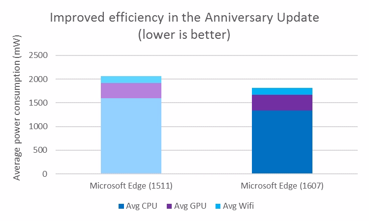Además para hacer un poco más de leña del árbol caído, Microsoft ha compartido una serie de estadísticas en las que destaca la reducción del consumo que han logrado a través de las diferentes versiones de Edge, reduciéndolo hasta en un 12 % de la versión 1511 a la 1607.