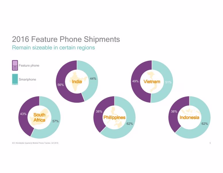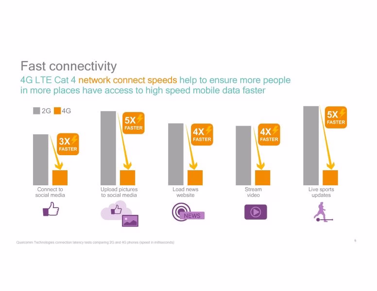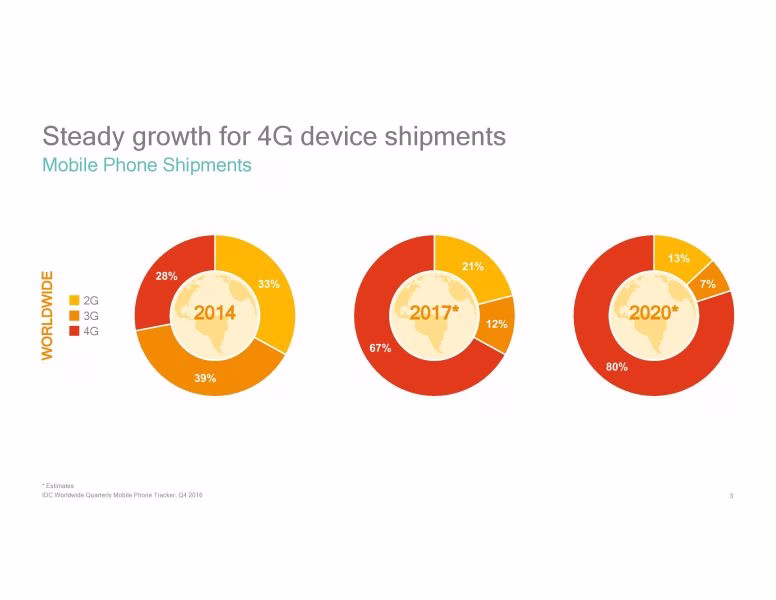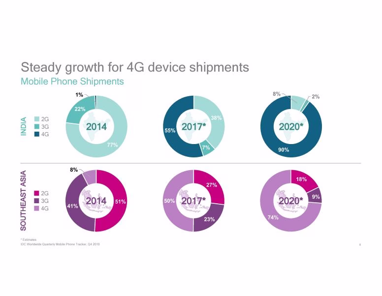 Qualcomm calcula que en 2020 el 74 % y el 90 % de los dispositivos vendidos en el sudeste asiático y la India dispondrán de LTE, pasando desde el 55 y 50 % en 2017.