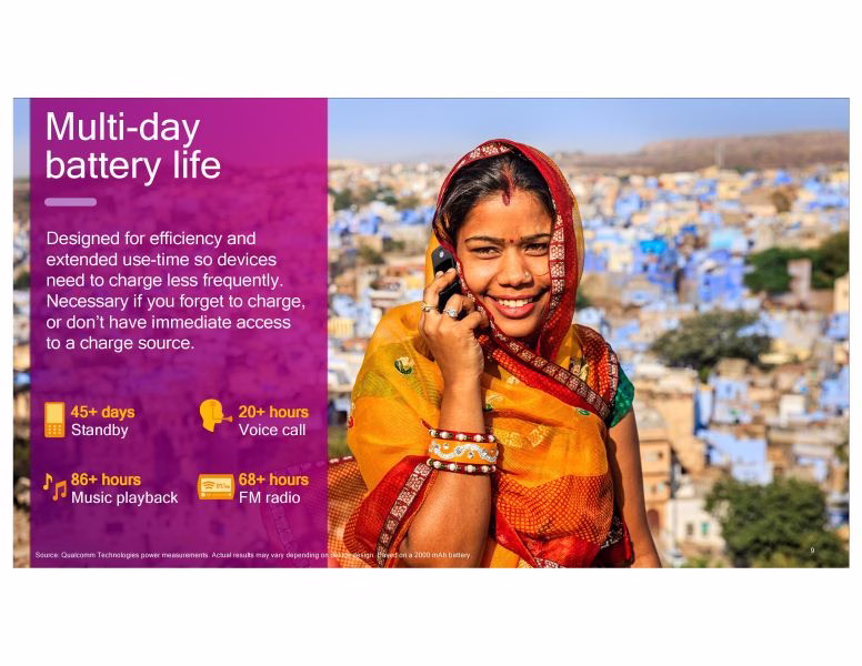 Se trata de un chip que incluye dos núcleos Cortex-A7 a 1.1 GHz con una GPU Adreno 304 y es capaz de usar memoria LPDDR2 y LPDDR3 y almacenamiento eMMC 4.5, fabricado a 28 nm. Es un procesador curioso en el año en que estamos, pero es que está orientado a los teléfonos básicos que todavía se siguen produciendo y vendiendo en grandes cantidades en los países en vías de desarrollo. De hecho, la compañía ha desarrollado este SoC en la India, bajo su acuerdo de colaboración con el Gobierno del país de Hecho en la India.