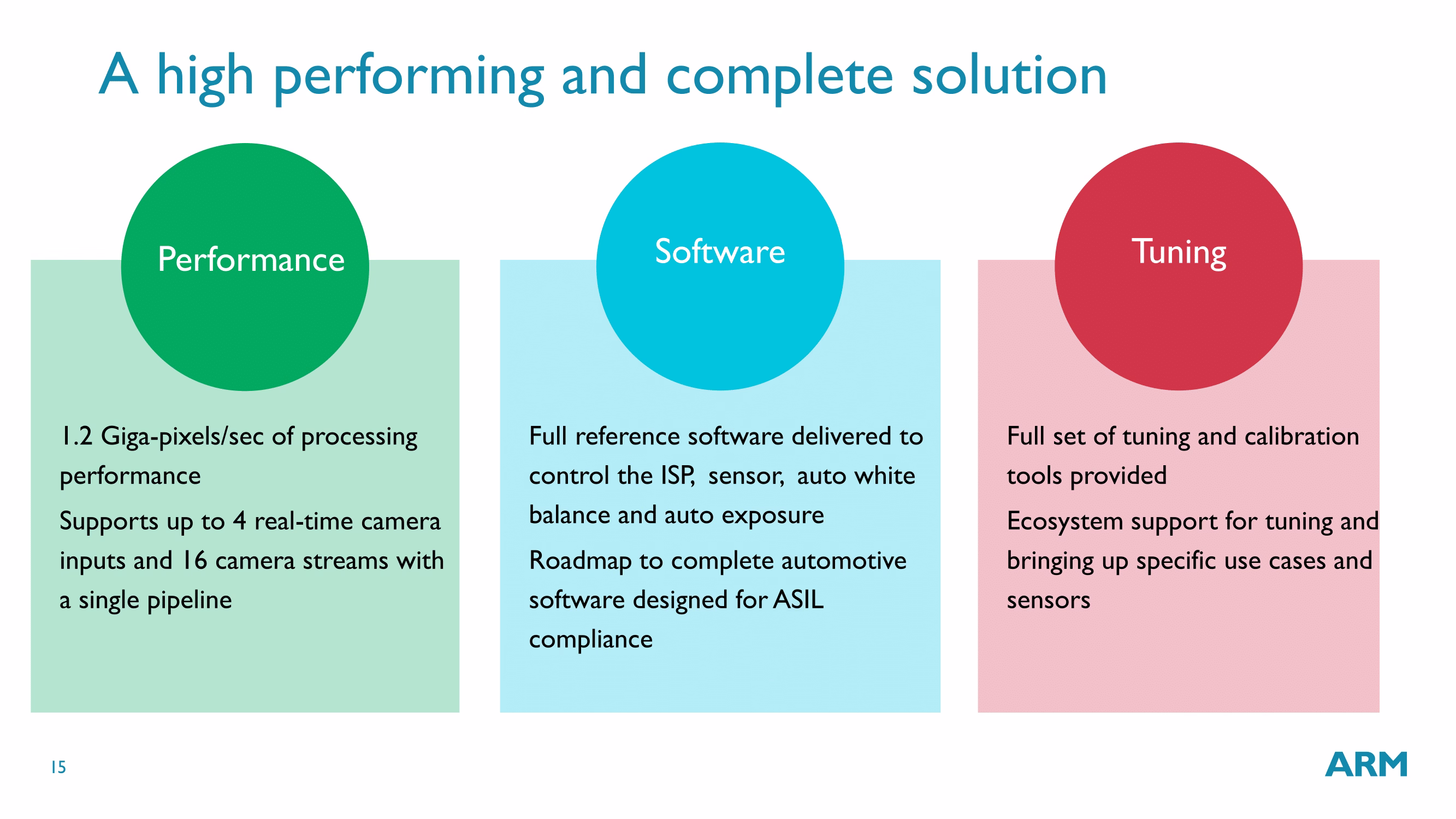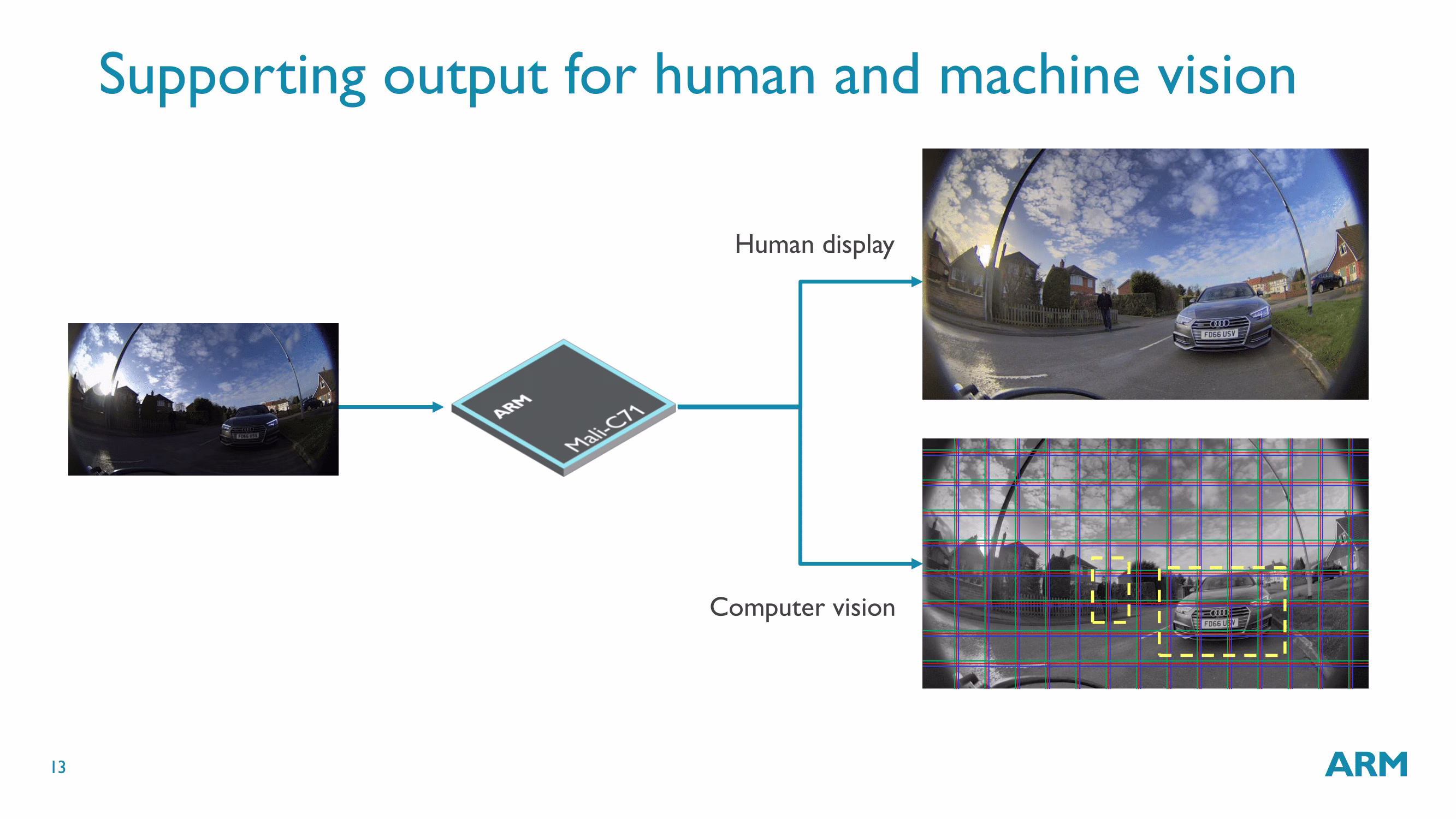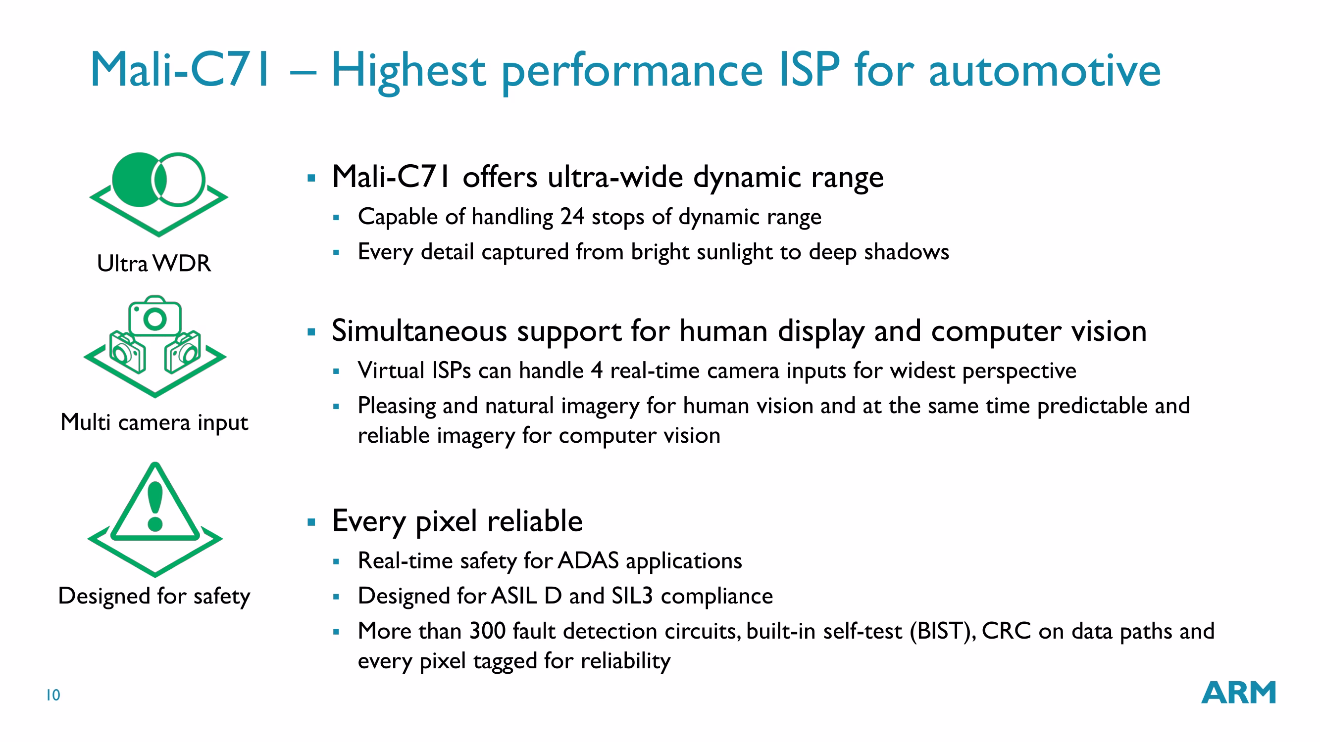 Uno de los objetivos que tiene ARM con este tipo de chips es la de que la industria utilice únicamente soluciones basadas en captura de imágenes en la conducción autónoma. El Mali-C71 puede mostrar imágenes para una pantalla del vehículo así como inyectar el resto a sistemas de visión computerizada para su análisis. Puede procesar hasta 1.2 gigapíxeles por segundo con cuatro cámaras en tiempo real y 16 capturas de cámaras simultáneas.