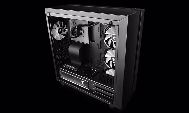 El panel derecho dispone de agujeros de ventilación para los tres ventiladores RGB de 140 mm que incluye sujetos en el lateral derecho. Hay otro ventilador RGB de 140 mm de serie en la parte trasera, y se pueden instalar otros tres de 120 mm en la parte superior y otros tres en el frontal. El interior es muy espacioso para sistemas de refrigeración líquida personalizados. La fuente de alimentación va en su propio compartimento, con un logo con iluminación RGB. En la parte superior hay una tira de ledes RGB para iluminarlo, y en el frontal hay un tubo con iluminación que se puede usar para integrarlo en sistemas de refrigeración líquida personalizados.