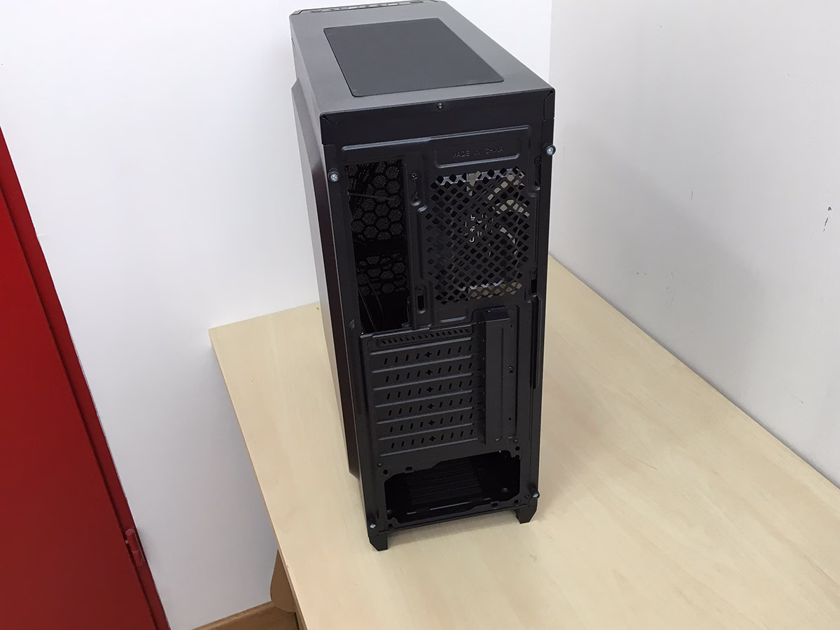 Está fabricada en acero y plástico, con una malla frontal tras la cual se encuentra una espuma. En la parte superior hay una abertura para salida de aire recubierta por una rejilla magnética, y en la parte inferior, en la zona de la fuente de alimentación, hay una fina rejilla retirable. El diseño es básico, sin adornos, con el lateral derecho abombado para permitir la gestión del cableado y que no haya problemas al poner la tapa, y el panel derecho incluye una ventana transparente de plástico, aunque esta ventana no sea demasiado grande. Ambos paneles llegan sujetos con unos típicos tornilos moleteados.