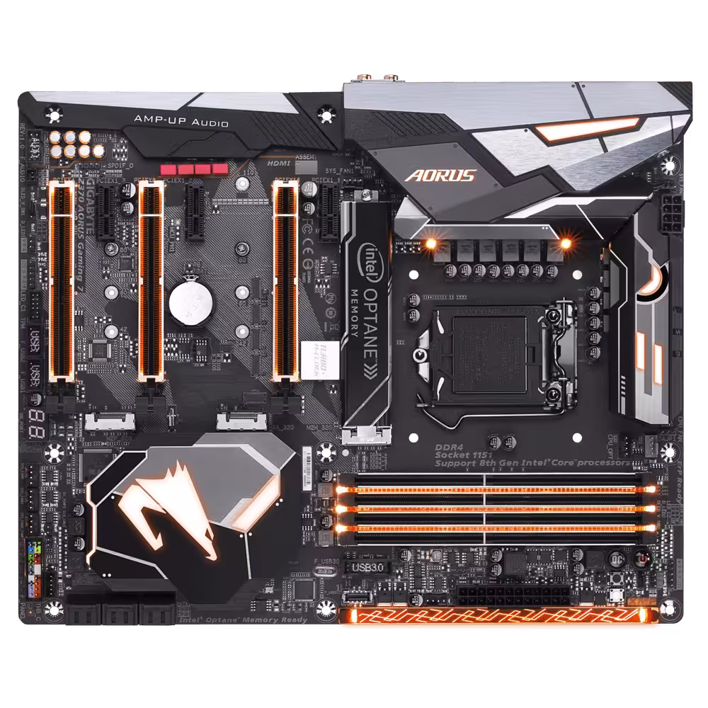 A través de su marca jugona Aorus, Gigabyte va a ofrecer las placas Z370 AORUS GAMING 7-OP, Z370 AORUS ULTRA GAMING WIFI-OP, Z370 AORUS ULTRA GAMING 2.0-OP, y Z370 HD3-OP, con un módulos M.2 de memoria Optane de 32 GB. Puede actuar como memoria caché de discos duros, situándolos en la línea de los discos duros híbridos que integran una memoria NAND, pero también de los SSD, aunque en este caso no se note excesiva diferencia de rendimiento.