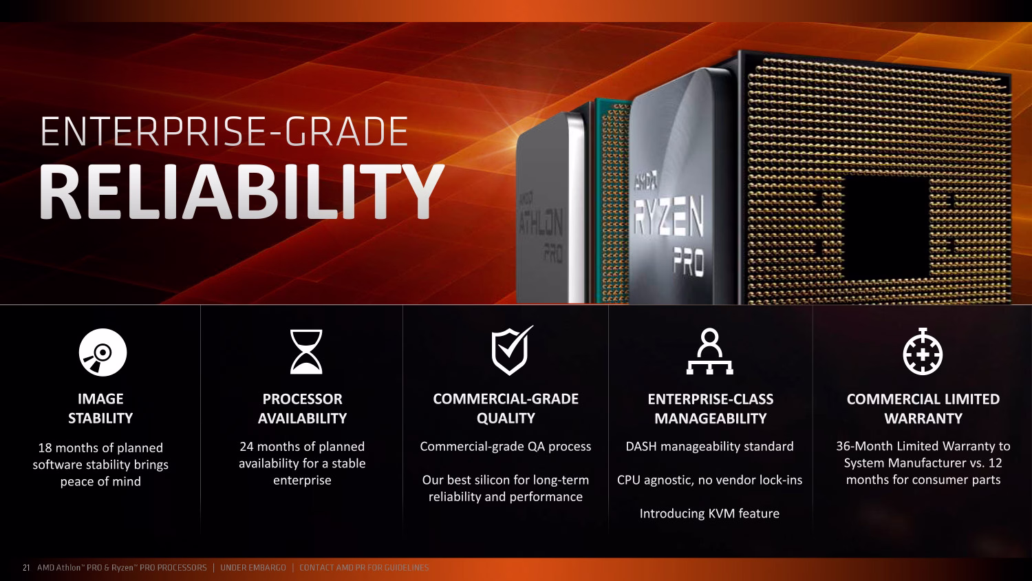 AMD acompaña a estos procesadores con tres años de garantía limitada proporcionada por los integradores de equipos (OEM), prometiendo además que estarán en producción durante al menos 24 meses. Pero además, AMD indica que para esta serie utiliza los mejores chips que produce para asegurar que los equipos funcionan durante un periodo de tiempo aún mayor.