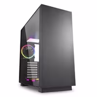 Por ejemplo, en esta caja la fuente de alimentación se sitúa en la parte superior. Las posiciones de ventilación en esta caja son todas para ventiladores de 120 mm: tres en el frontal, tres en la parte inferior, dos en la parte derecha y uno en la posterior. Dependiendo del modelo elegido, llega con dos ventiladores preinstalados, o cuatro con iluminación RGB.