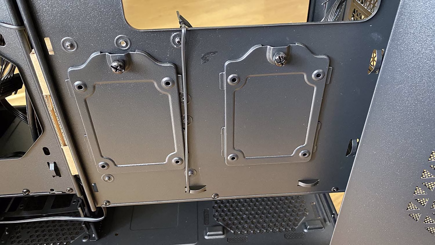 Donde no hay tanto espacio es en la zona de los ventiladores superiores, donde no parece que haya mucho espacio para un radiador de 240 mm, y no sería la mejor posición para ello. Para uno de 120 mm podría ser suficiente. La refrigeración de serie incluye un ventilador de 120 mm en el frontal y otro en la parte trasera. Las unidades de 2.5 pulgadas que se pueden montar en la plancha de sujeción de la placa base disponen de sus propias bandejas sujetas con tornillos moleteados.