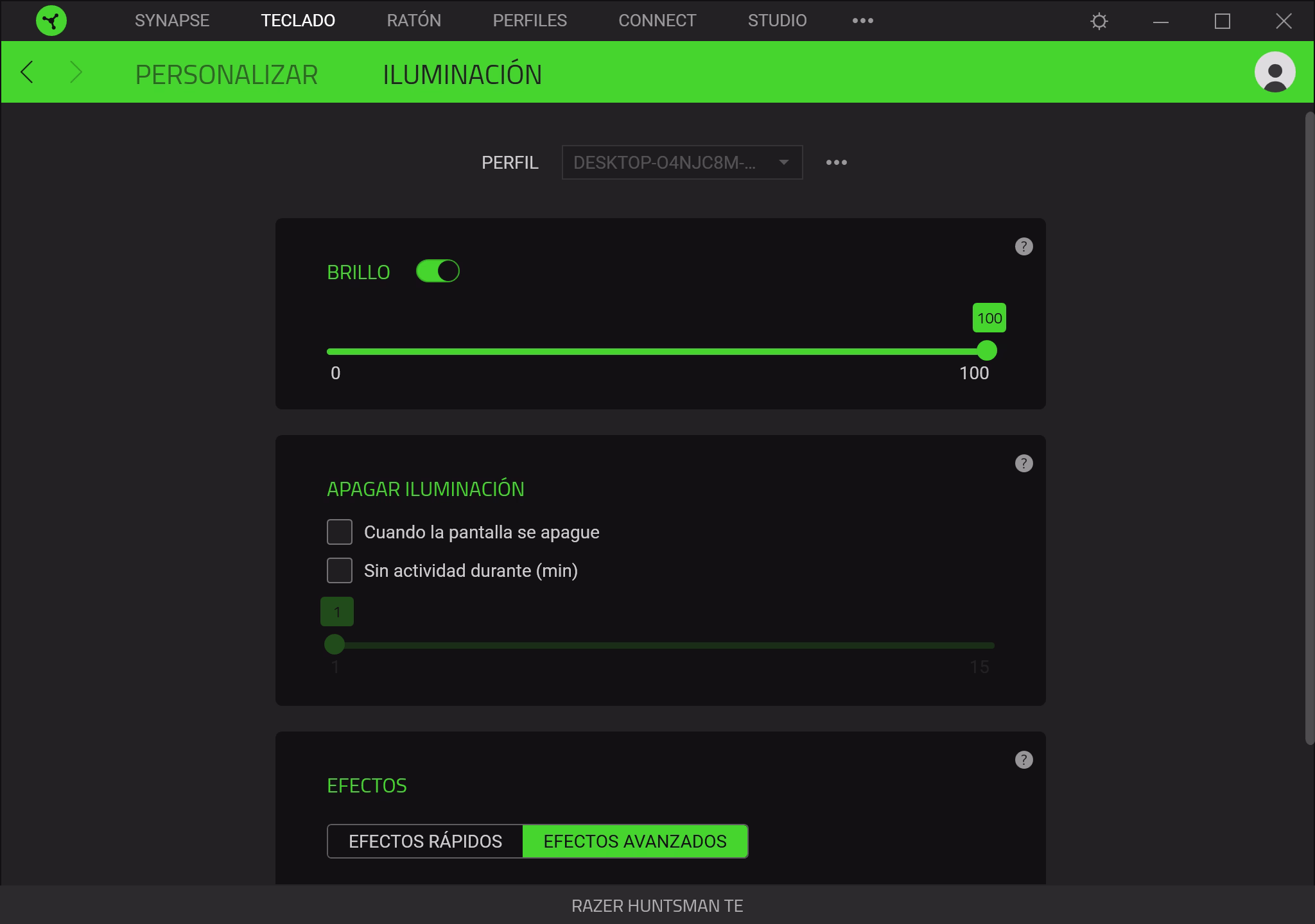 En cuanto al programa de configuración, todo se realiza a través de Synapse 3.0. Es muy completo en cuanto a características, con una buena interfaz gráfica, y permite configurar todos los dispositivos de la compañía (o compatibles de otras). Desde este programa se pueden crear y modificar macros, cambiar las acciones de todas las teclas, y la iluminación a través de Chroma Studio. Esa iluminación se puede sincronizar con otros dispositivos conectados al equipo.