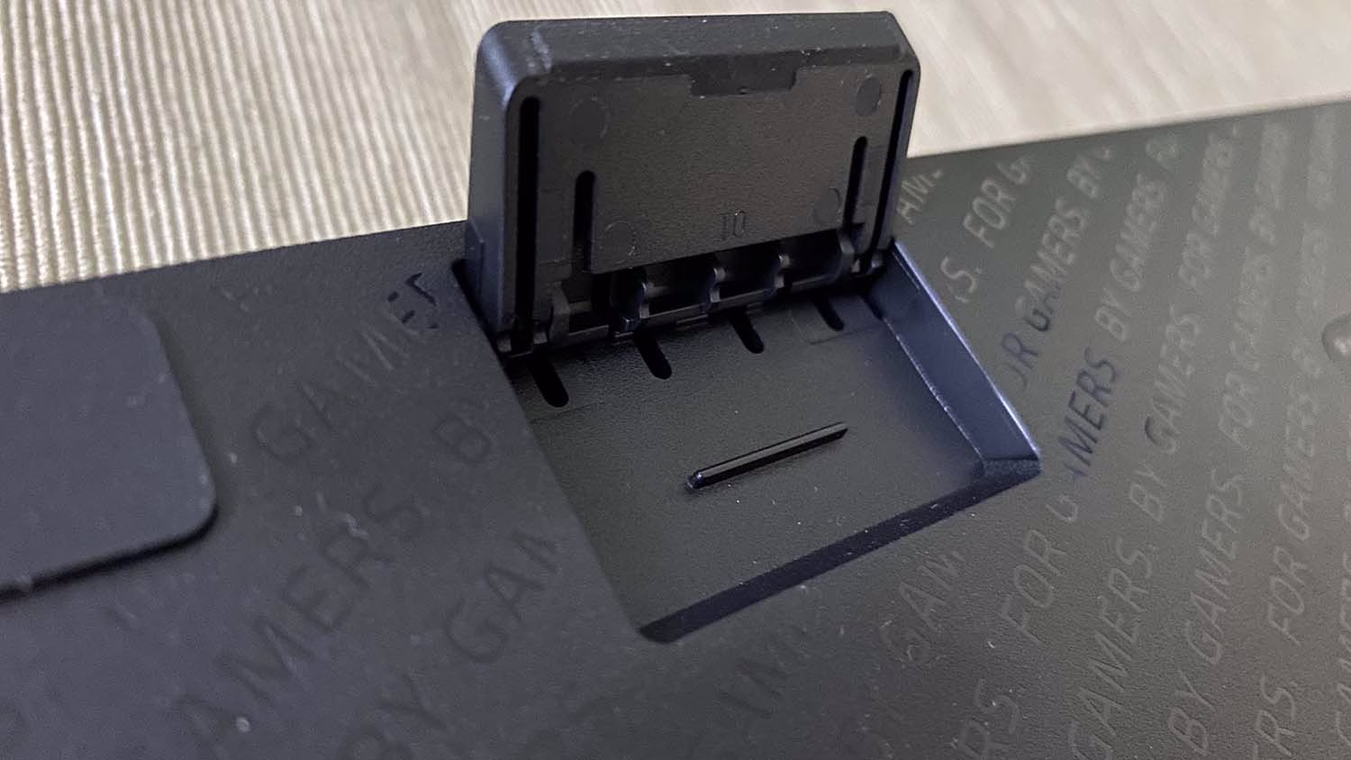 Para facilitar el transporte este teclado, como otros compactos, tienen un cable separable. El incluido con el Hunstman Tournament es un cable forrado de tela trenzada que por un lado tiene un USB tipo A y por el otro, para conectar al teclado, un USB tipo C; el conector está en la parte izquierda del teclado. Las patas inferiores permiten la regulación en altura del teclado en dos posiciones diferentes.