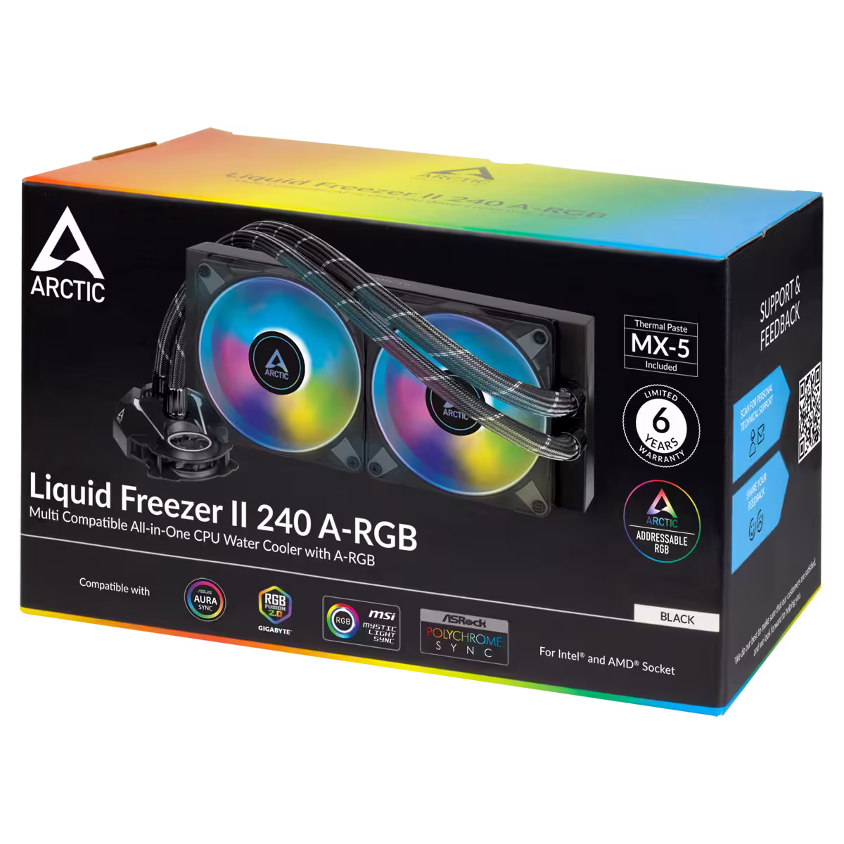 La empresa alemana ARCTIC cuenta posiblemente con la mejor serie de refrigeración líquida rendimiento-precio del mercado si no te interesa que tenga iluminación. La serie Liquid Freezer II incluye entre otros un modelo 240 que ha sido actualizado para ofrecer también en versiones con dos ventiladores de 120 mm con RGB y con ARGB. Eso sí, los ventiladores varían ligeramente sus características, perdiendo rendimiento.
