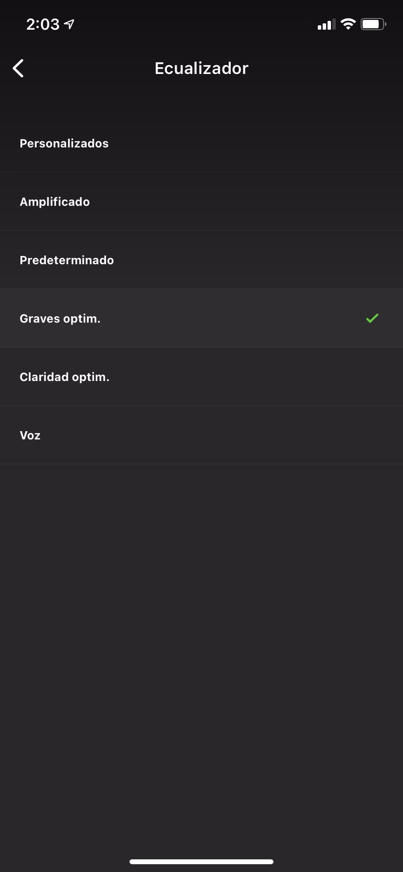 El ecualizador es más avanzado que el que tenía la aplicación para el modelo anterior. Ahora además de unos preajustes hay un modo personalizado en el que se puede modificar la respuesta en frecuencia en diversos rangos. Como ocurriera en el modelo anterior, sigo recomendando la opción de graves optimizados ya que el ajuste predeterminado no realza tanto los graves.