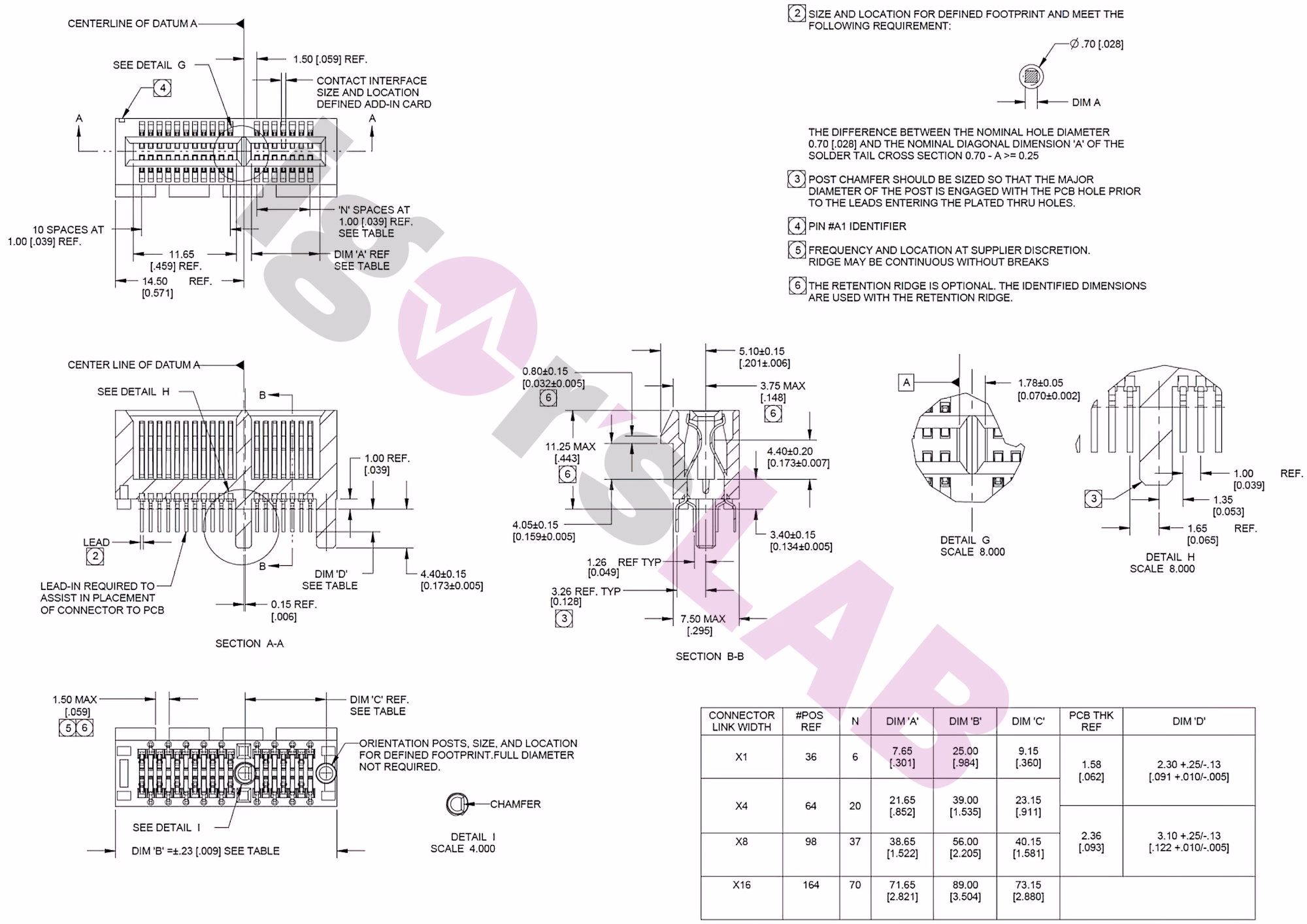 El tamaño de los pines sería algo menor, espaciados a 3 mm en lugar de a 4.2 mm. Cada pin de corriente llevaría hasta 9.2 A para un total de unos 55 A, que a 12 V serían unos 660 W. Teniendo en cuenta un margen de seguridad, se quedaría en que puede entregar de manera segura unos 600 W. El retenedor de este conector tendría también un diseño similar y debería de aguantar al menos una fuerza de 45 N, que no es mucho todo sea dicho, pero si para evitar que se saque del sitio por azar. Debajo de los pines principales habría cuatro contactos para otras señales.