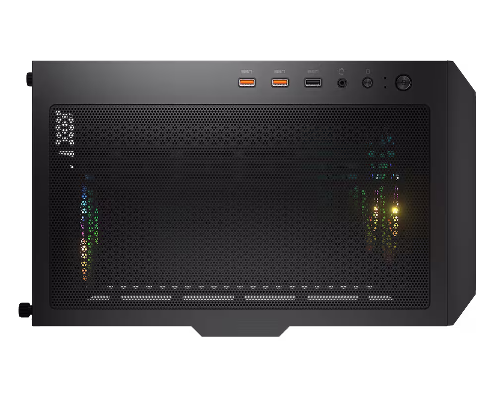 En el panel frontal de conectores hay dos USB 3.0, un USB 2.0 y una toma de audio de 3.5 mm de cuatro polos. Las posiciones para ventiladores incluyen dos de 120/140 mm en el frontal, dos de 120/140 mm en la parte superior y uno de 120/140 mm en la parte posterior. Hay tres ventiladores preinstalados con ARGB, dos de 140 mm en el frontal y uno de 120 mm en la parte trasera. Van a un concentrador RGB para facilitar la gestión desde una placa base.