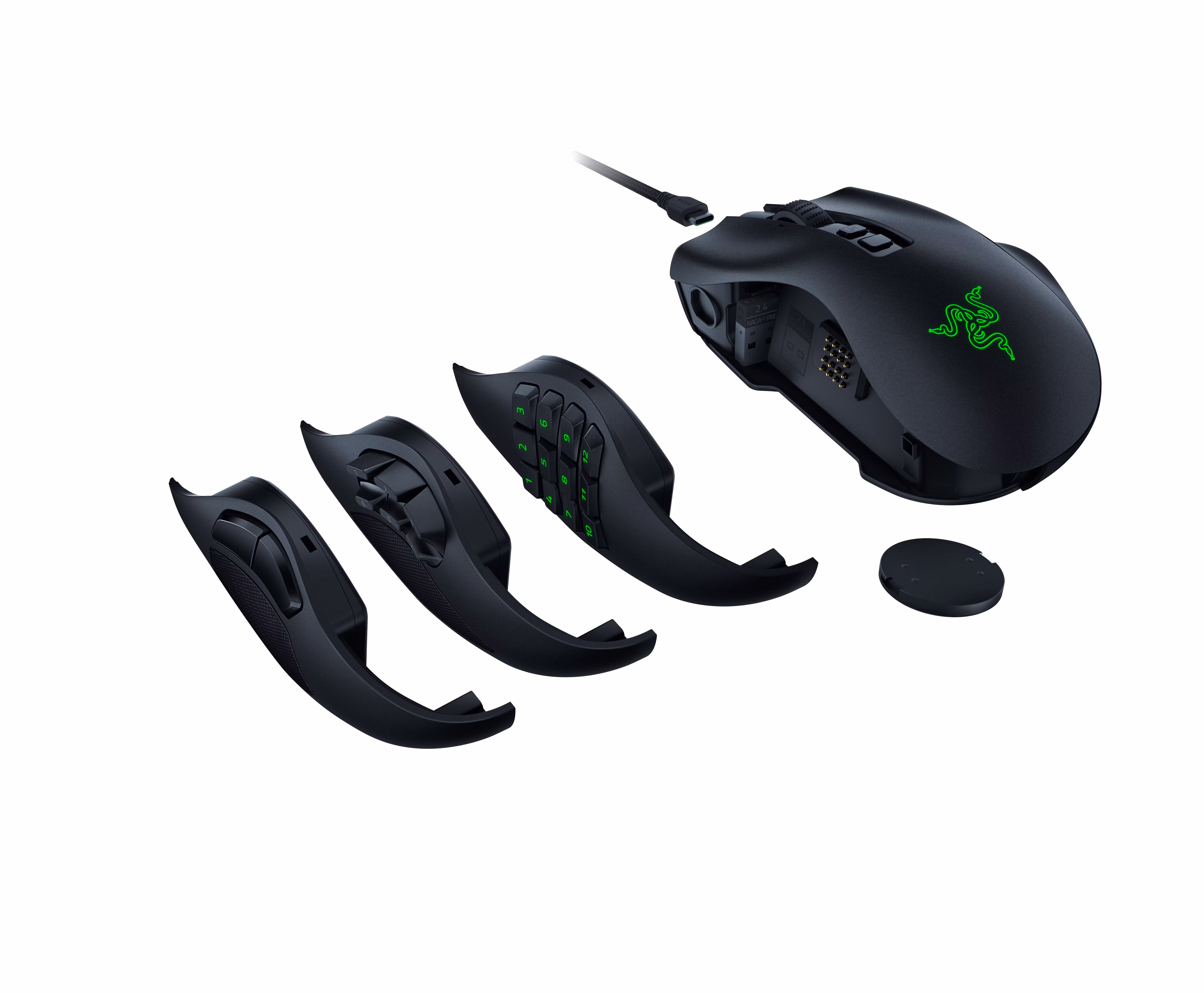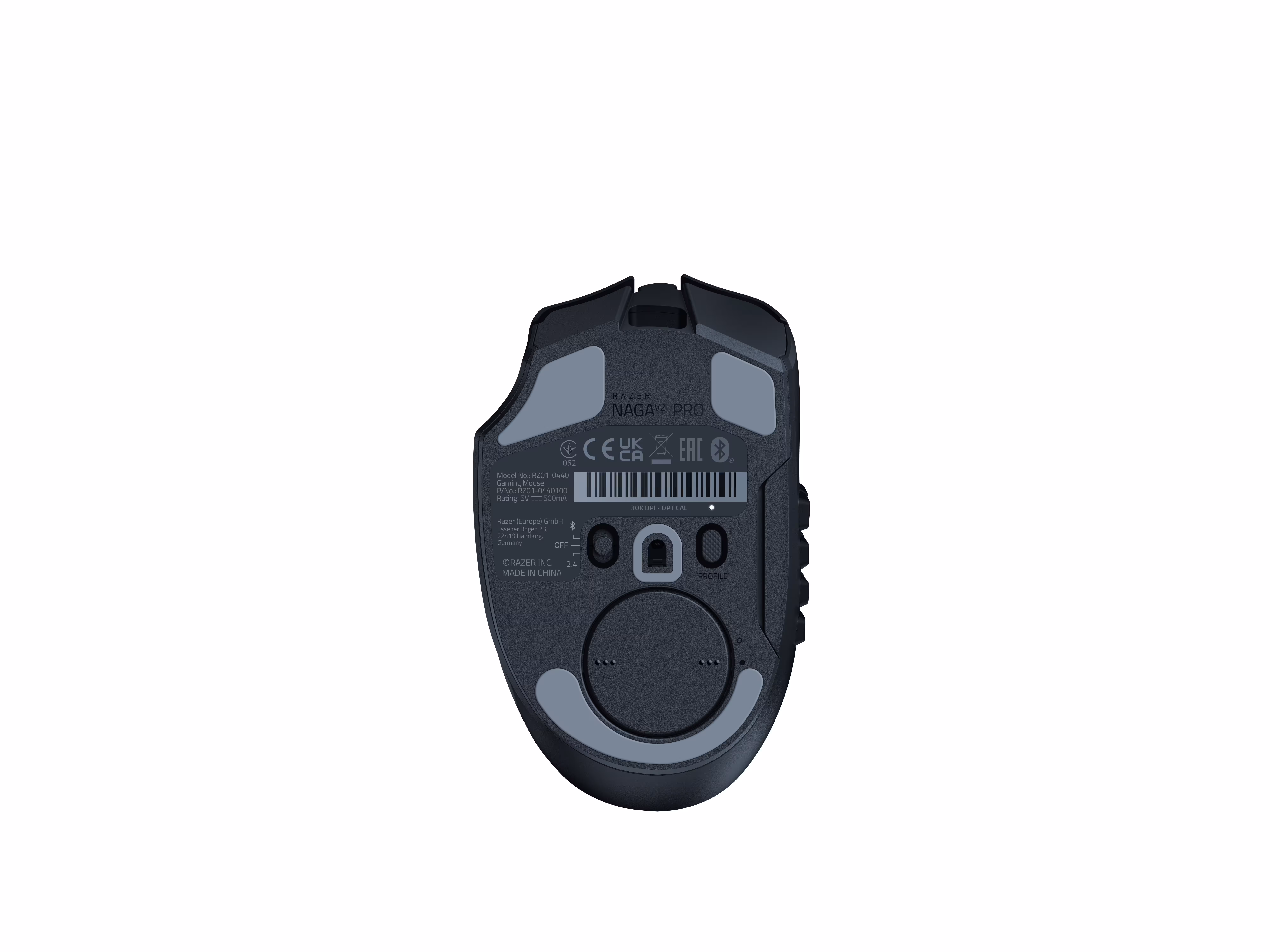 La conectividad es triple: cable USB tipo C, Bluetooth (300 h de autonomía) y mediante adaptador USB (150 h). Razer ha incluido en el Naga v2 Pro el nuevo sistema de carga inalámbrica, por lo que la tapa circular inferior, que oculta el hueco donde se guarda el adaptador USB, se puede cambiar por una tapa magnética de carga inalámbrica para que se quede bien en la nueva base de carga inalámbrica. La anterior base de carga inalámbrica era bastante mala, dejando de funcionar con el paso de solo unos meses por falta de contacto entre los pines de la base y los contactos del ratón.