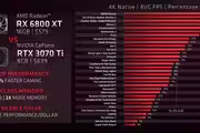 A continuación la compañía pone sus habituales comparativas de rendimiento por dólar, que siempre suele salir ganando. Además, en varias de ellas añade juegos con trazado de rayos, que me parece genial porque ocultarlo habría sido criticable teniendo en cuenta de lo que habla en el artículo. En esos juegos sale por lo general bastante perjudicadas sus tarjetas gráficas, porque es un terreno en el que todavía tiene mucho que mejorar. Pero aun así, en algunos sale bastante bien parada debido a que esos juegos superan la VRAM que tiene disponible las tarjetas gráficas de NVIDIA.