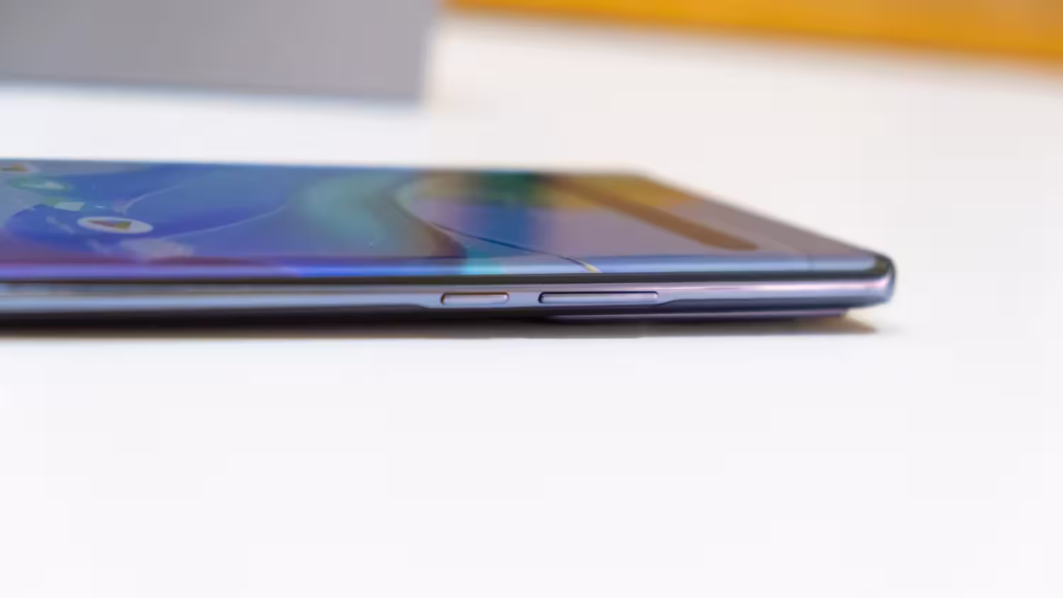 En el lateral derecho están los botones de volumen e inicio. En esta ocasión el lector de huellas está integrado en la pantalla como buen modelo OLED que es. Si se ha configurado bien la huella, la reconoce rápidamente y el desbloqueo es casi instantáneo. Además, solo al configurar la huella la pantalla se activa a los toques o al levantar el móvil, aunque solo la parte inferior. No mostrará notificaciones u otra información.