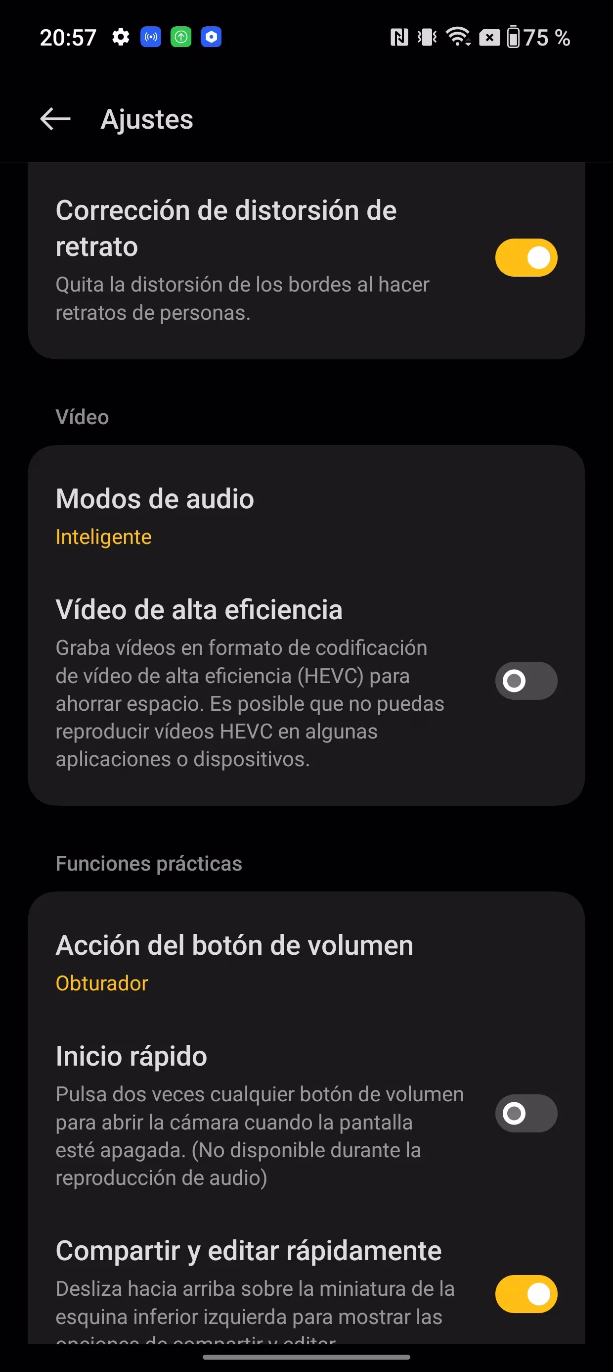 Hay un apartado con más opciones genéricas al que se accede pulsando un símbolo de hexágono con un círculo, por no poner el habitual engranaje. En el modo 'Pro' se puede guardar las imágenes en DNG para editarlas posteriormente. Este modo, como es normal, requiere saber lo que se hace para sacarle provecho. La edición en Photoshop de estos archivos DNG es completa en lugar de una versión básica que suelo ver en estos archivos guardados en móvies más baratos.