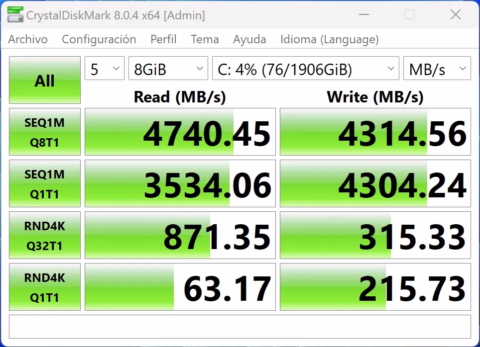 En CrystalDiskMark 8 alcanza los 4.7/4.3 GB/s de lectura/escritura secuencial, así como los 871/315 MB/s de lectura/escritura aleatoria como máximo. El mínimo en la peor situación, eliminando el paralelismo de estas unidades, 63/215 MB/s. No es la mejor unidad PCIe 4.0 ×4 del mercado, pero el rendimiento para el día a día y para juegos o uso profesional es bueno.