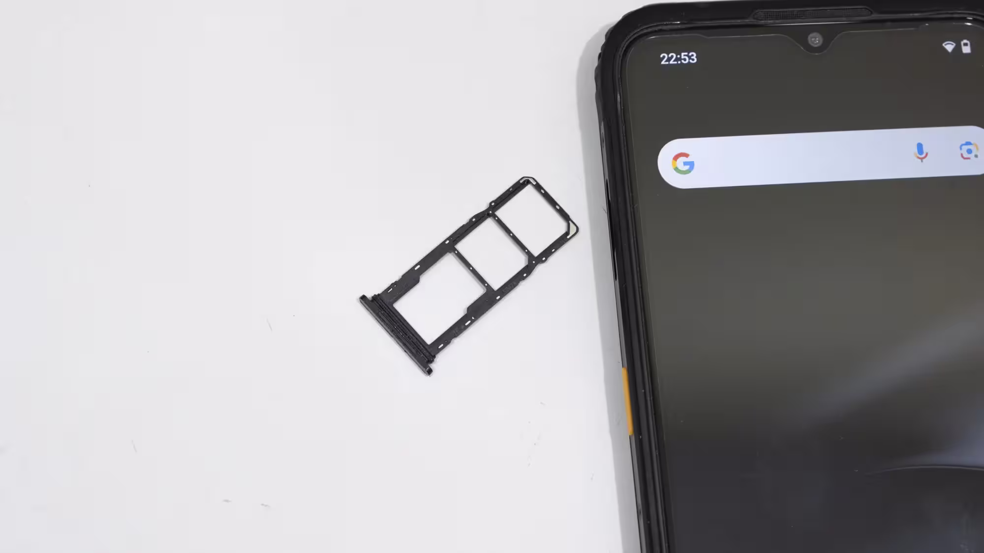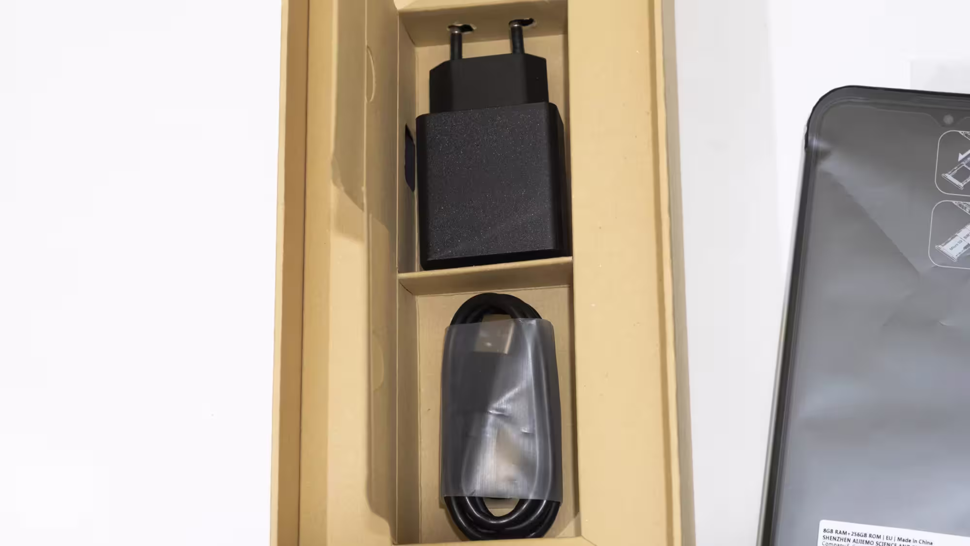 Al retirar esa bandeja se ve el cable USB tipo C a USB tipo A de recarga, y el cargador de 10 W (5 V y 2 A), que resulta escaso para los 4900 mAh de batería que incluye el móvil. No hay alfiler para extraer la bandeja de tarjetas porque el diseño del móvil está hecho a prueba de agua y polvo con certificado IP68/IP69K. En su lugar, se extrae con el dedo, aunque no es especialmente fácil. En la bandeja se pueden poner dos nano-SIM y una micro-SD de hasta 512 GB.