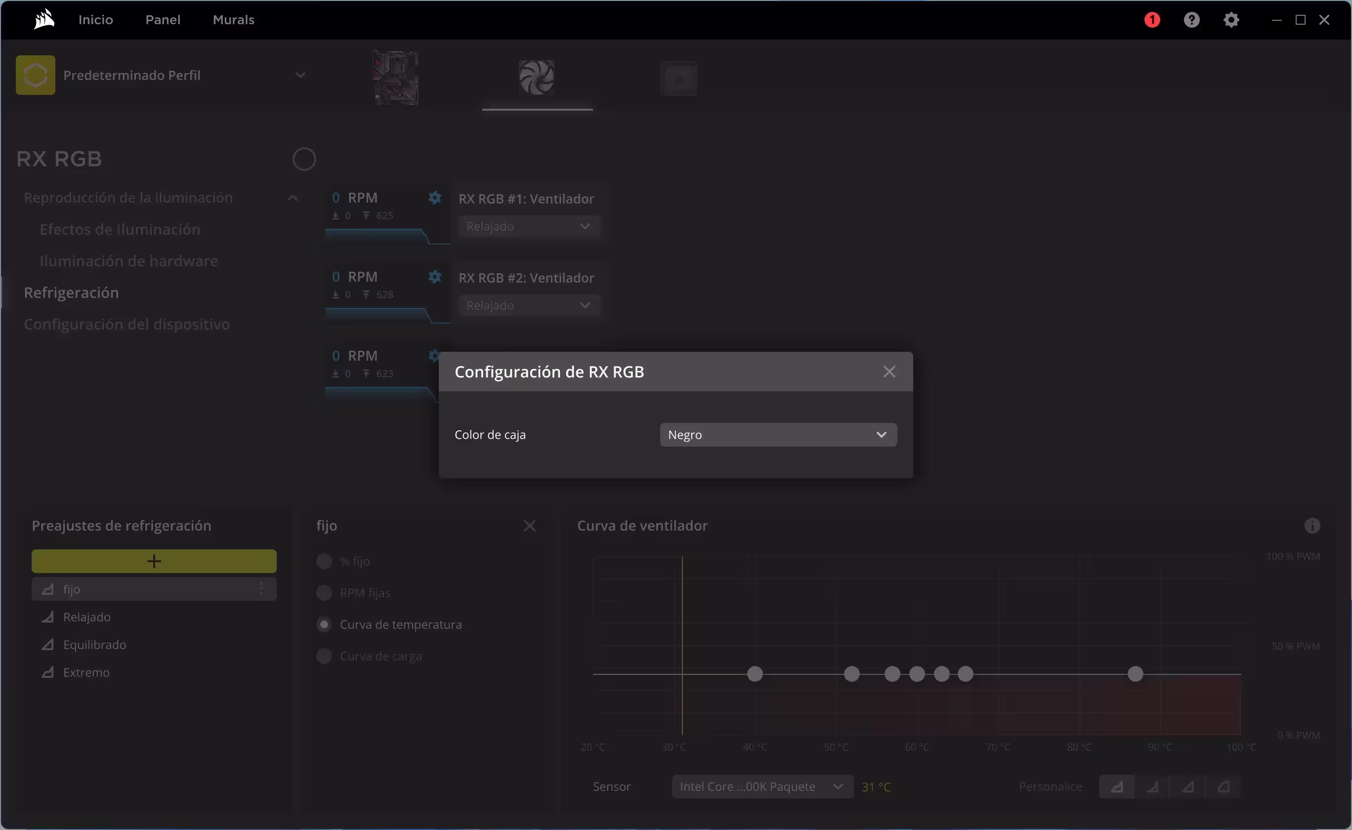 Los apartados de configuración incluyen la iluminación cuando iCUE esté ejecutándose, cuando no lo esté, y la gestión de la velocidad de los ventiladores. Por defecto hay tres perfiles: 'relajado', que básicamente no los activa prácticamente nunca; 'equilibrado', que funcionarán a 300 r. p. m. habitualmente o a entre 600 y 800 r. p. m. cuando se esté haciendo algo que tire de procesador; y 'extremo' que hace que funcionen a 800 r. p. m. y los sitúa a unas 1400-1500 r. p. m. con la CPU en carga completa. Esto último da como resultado un ruido de unos 37 dB, que no es molesto pero se hace presente, sobre todo porque tiene una ligera componente aguda, además de que están todo el rato subiendo mucho y bajando mucho sus revoluciones y es lo que resulta molesto. Recomiendo ajustar manualmente la curva de velocidad de los ventiladores.