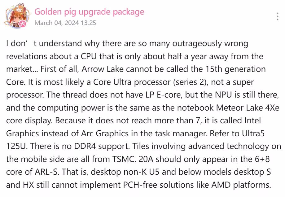 Sobre la CPU lo que indica es lo que ya se ha venido comentando anteriormente. No serían compatibles con DDR4, y los núcleos no tendrían multihilo simultáneo, que en el caso de Intel lo llama Hyper-Threading y es una marca registrada. Tampoco habría los dos núcleos E de bajo consumo de los Meteor Lake. Además, el proceso litográfico 20A de Intel se usaría solo en el chíplet de núcleos del modelo de 6 núcleos P y ocho núcleos E. Los procesadores no se llamarían Core de 15.ª generación sino Core Ultra de 2.ª generación, que por otro lado es lo que se espera.