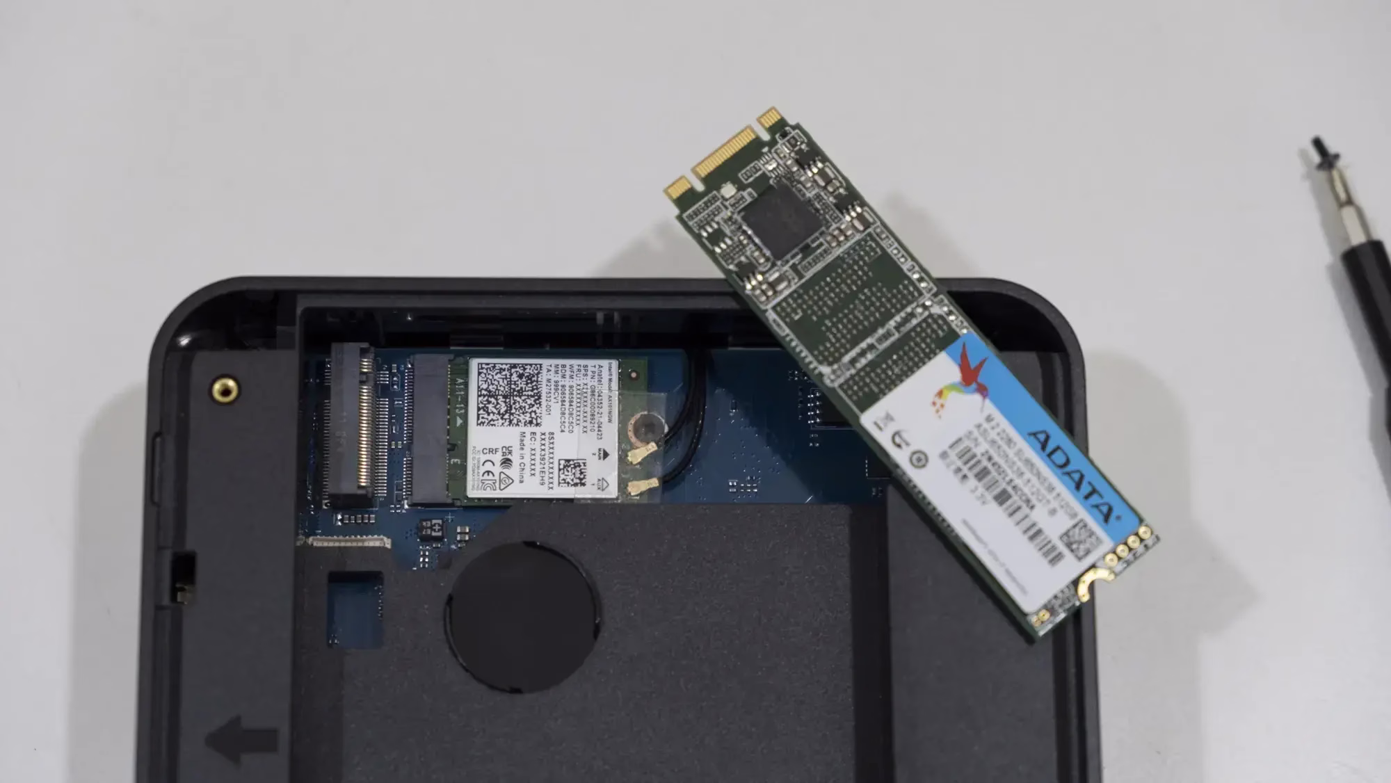 Si se quita la SSD se puede ver una tarjeta M.2 2230 combo de Bluetooth y wifi 802.11ax. He intentado seguir desmontando el equipo, y para ello se tienen que quitar cuatro tornillos de difícil acceso. Tras ello, hay que hacer bastante el bruto para separa ambas parte de la LarkBox X, por lo que no he continuado el desmontaje.