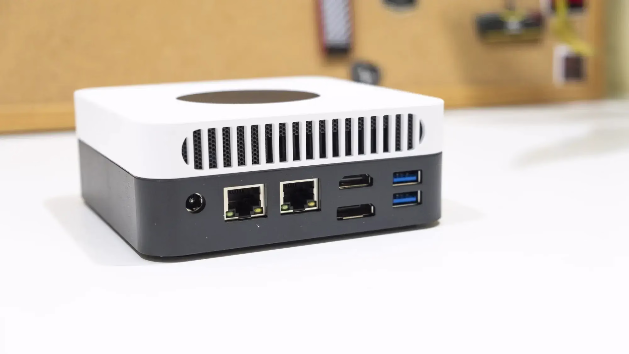 El LarkBox X es un mini-PC de buen tamaño para la potencia que tiene, con 49 mm × 127 mm × 127 mm, lo cual son 0.8 L y por tanto, aunque es igualmente pequeño, está en la parte alta del tamaño de una unidad con un N100. El diseño externo es bonito, y combina los colores blanco y negro.
