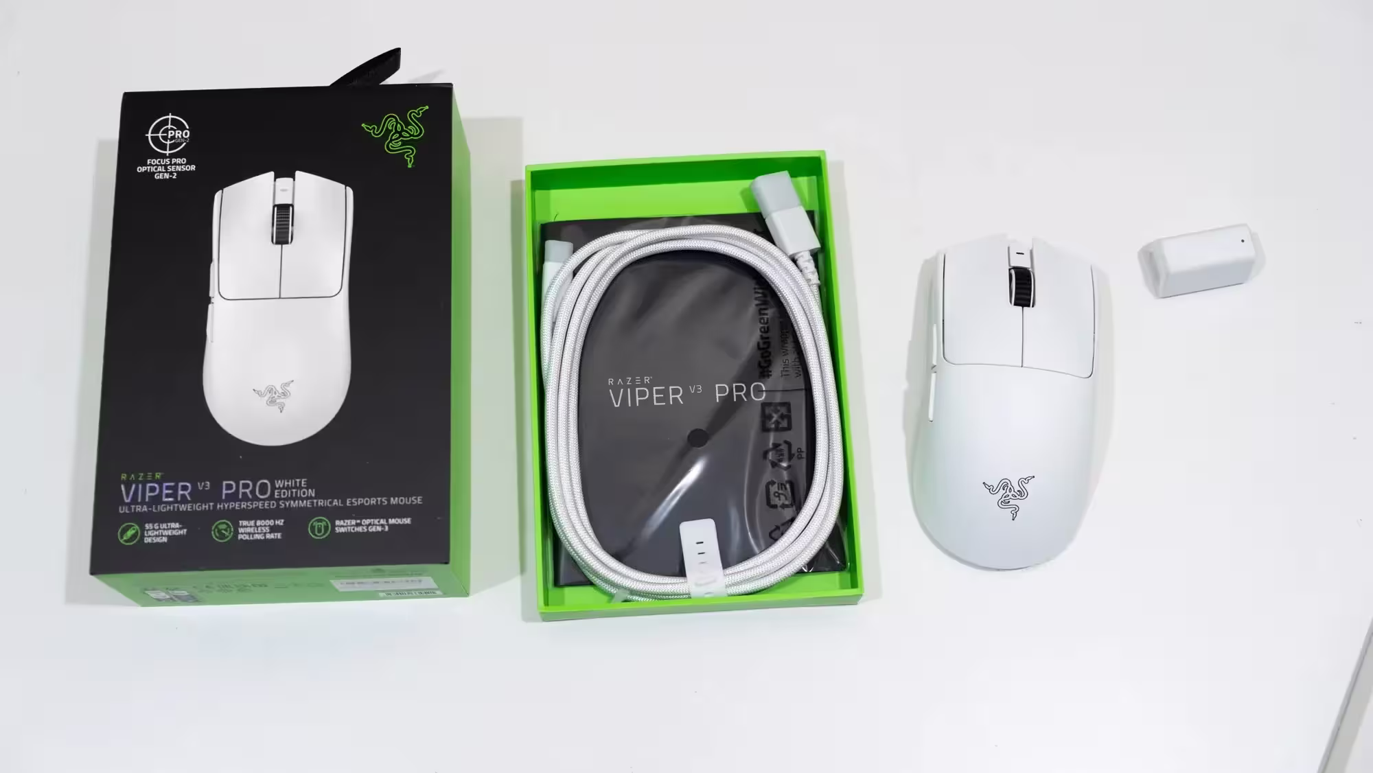 Al abrir la caja se puede ver el ratón en una bandeja de cartón junto al receptor Hyperpolling el cual se suele vender por separado por 35 euros y que va en el precio del Viper v3 Pro. Debajo de la bandeja se puede ver el cable, de 1.8 m de longitud con un USB tipo C en un lado y un USB tipo A en el otro, estando forrado de tela trenzada. Es de muy buena calidad. Debajo está el manual de instrucciones y las pegatinas en una bolsa prescindible de plástico. También se incluyen unas tiras de goma para mejorar el agarre del ratón, aunque no me han resultado necesarias.