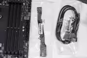 Debajo de la placa base se encuentran los extras, lo cual incluye una hoja con pegatinas, un díptico publicitario de MSI, un manual de instalación, otro con información de conformación lega de la UE, varias bolsas con tornillos para las SSD, cables SATA, un prolongador del cabezal del panel frontal de la caja, y una memoria USB para instalar los controladores.