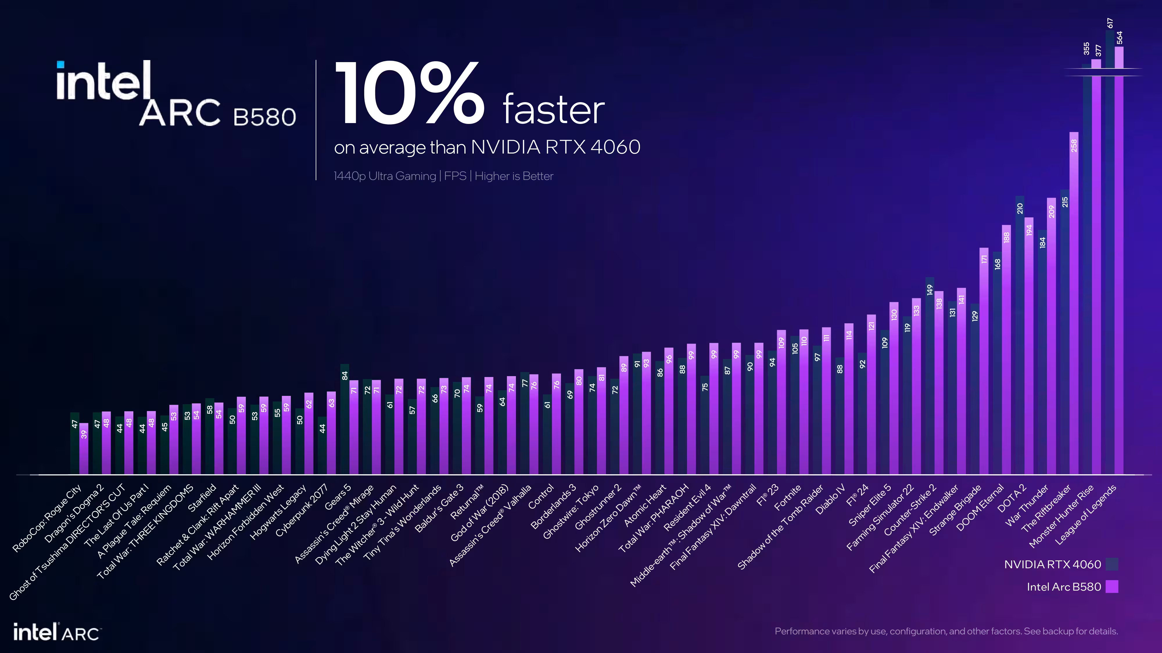 Intel ha asegurado continuamente en el último par de años que había localizado una serie de problemas a nivel de diseño de la arquitectura Alchemist que lastraba el rendimiento de las Arc serie A. Eso se ha corregido en la arquitectura Battlemage y de hecho lo destacable es que la Arc B580 da más rendimiento que la Arc A770 contando con menos ancho de banda de memoria y bastantes menos sombreadores. Lo cual quiere decir que ciertamente Alchemist no llegó fina, pero como primera arquitectura moderna no estaba mal.