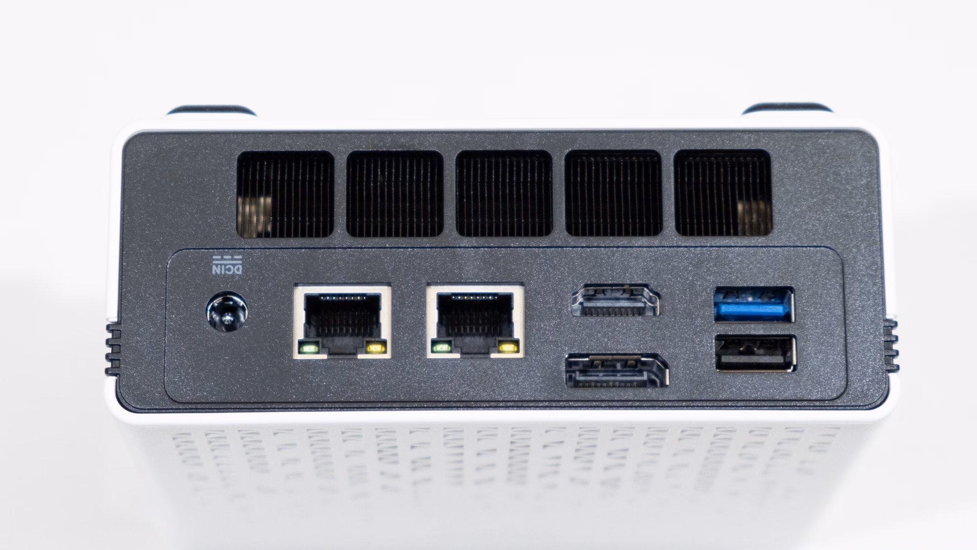En el frontal está el botón de arranque, un USB 4, dos USB 3.1, y una toma de audio de 3.5 mm. El USB 4 es compatible con datos, vídeo DP 1.4 (4K y 144 Hz) y carga de 100 W, por lo que en la práctica no se necesita el cargador incluido con conector tubular. Siempre es un gran añadido para un mini-PC, y para el monitor que uso, un U2725QE, es perfecto.