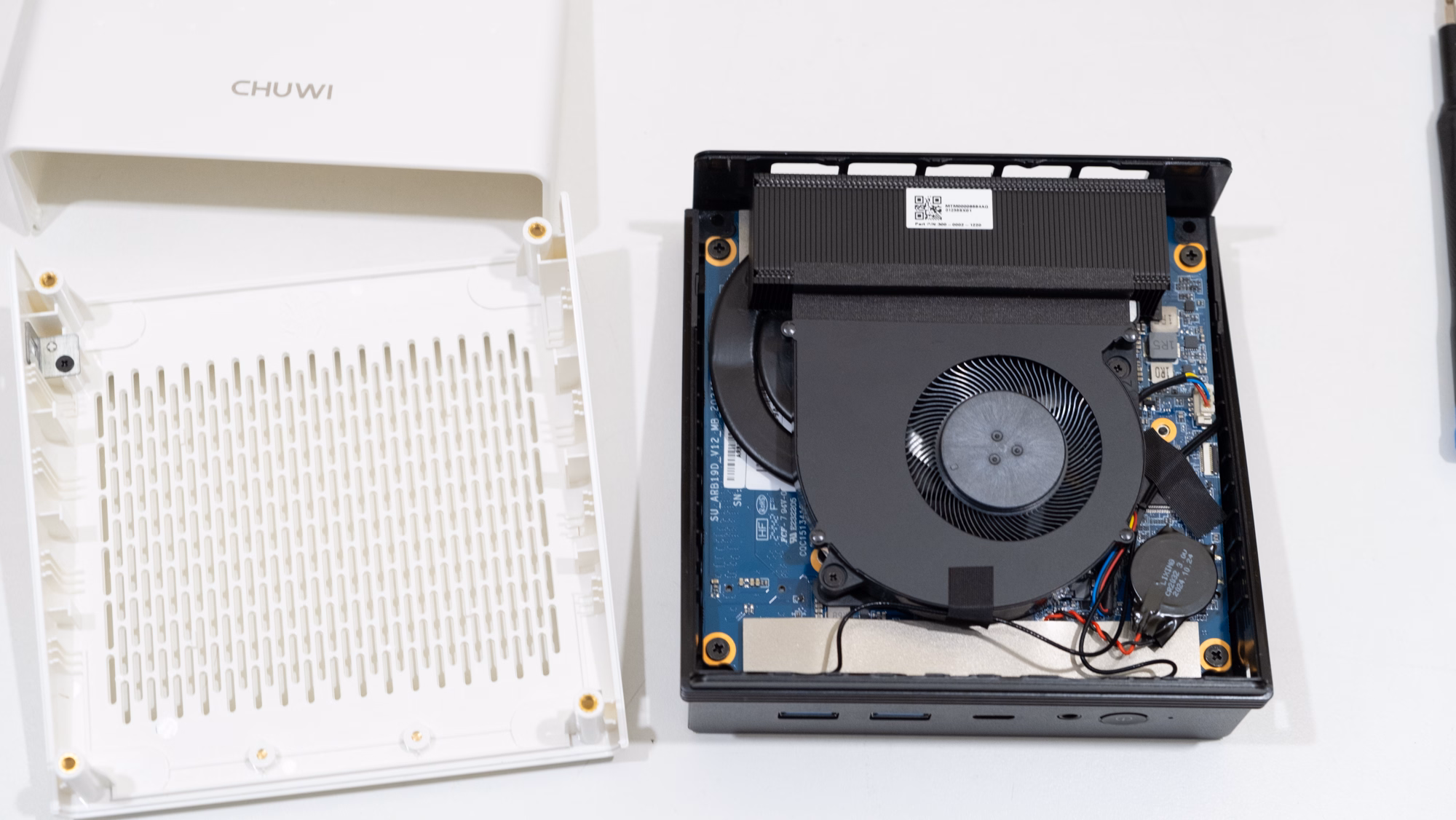 Este equipo tiene una carcasa de plástico, lo cual podría jugar en contra de sus temperaturas de funcionamiento. El ventilador está situado abajo, donde está el procesador, y en la parte superior de la PCB se acumula un poco de calor, pero no mucho porque hay cierto movimiento de aire desde la parte inferior. El procesador está configurado a una TDP de 45 W, que se traduce a un consumo en torno a los 45 W y con un turbo máximo de 54 W. Es más que los habituales 35 W de mini-PC similares, lo cual repercute en su rendimiento.