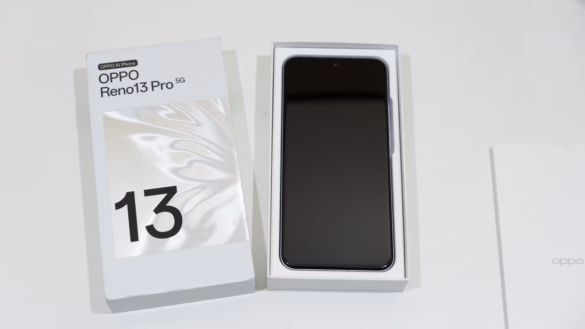 El Reno13 Pro 5G llega en una caja gris con holograma en la portada y con la mínima información del dispositivo en la parte posterior. Al abrirla se ve una carpeta de cartón en la que se incluye un par de manuales y un alfiler de apertura. Debajo se encuentra el móvil protegido por una cubierta de papel, y ya al fondo de la caja hay un cable de carga USB-C a USB-A. No se incluye el cargador por las leyes eurounionistas.