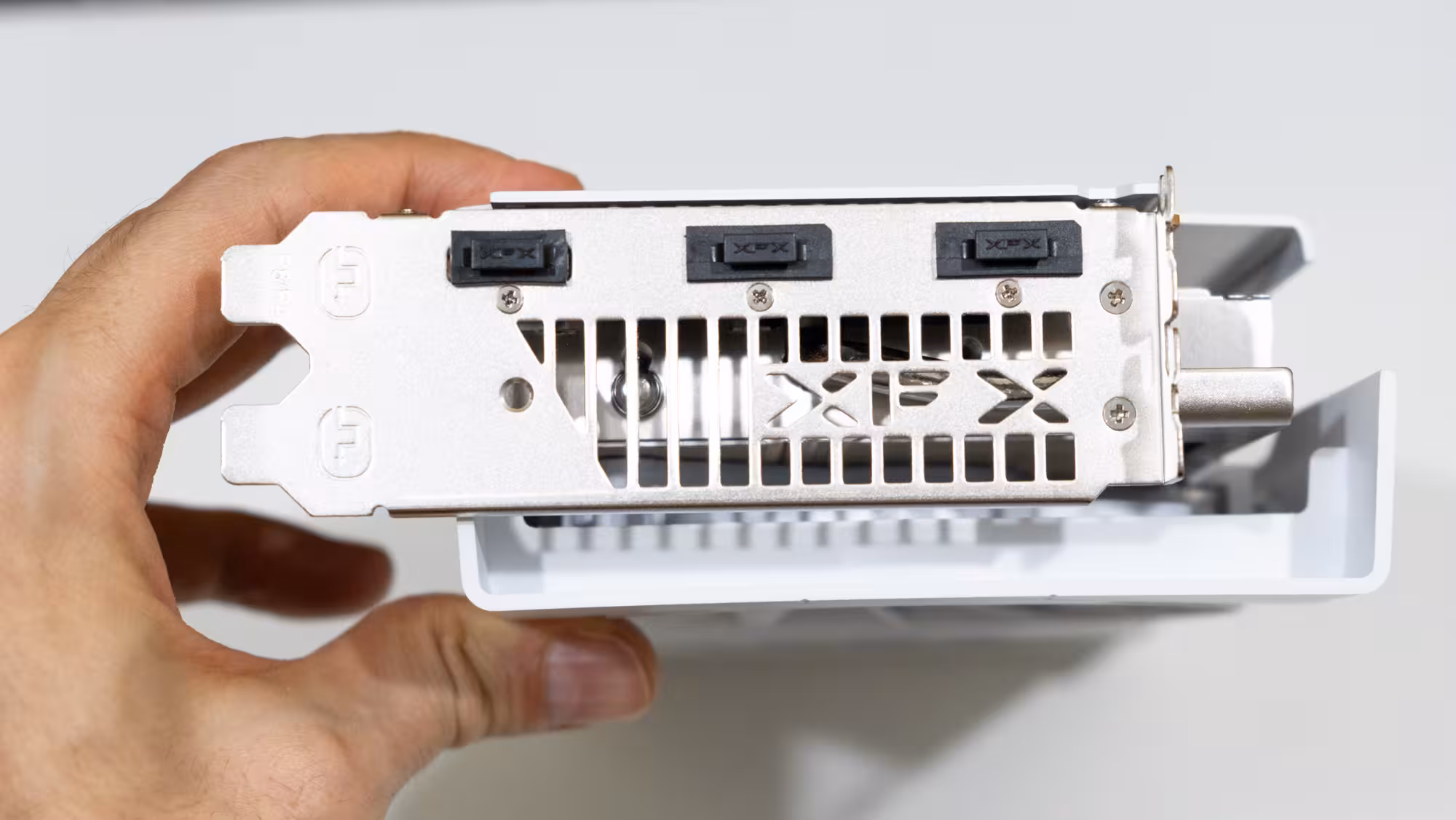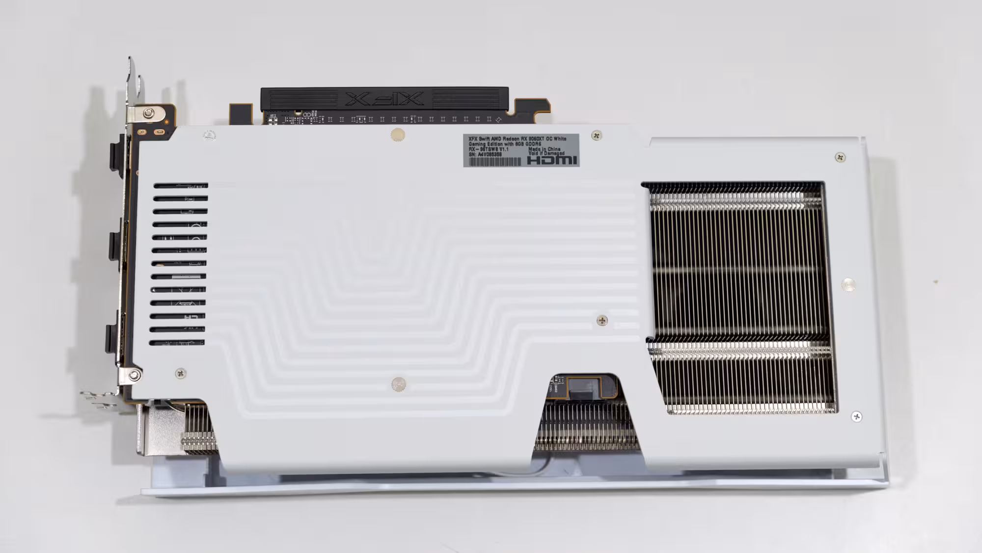 En la parte trasera se verá una placa de refuerzo y que el el ventilador derecho es de flujo a través, lo cual sirve también para mejorar aún más las temperaturas. Solo necesita un conector PCIe de ocho pines para funcionar. El diseño en general está bastante bien, sencillo, y resulta bonita en este color blanco, aunque no tenga nada de iluminación RGB, que por otro lado tampoco veo que la necesite.