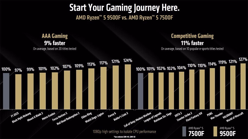 Los núcleos funcionan a una frecuencia base de 3.8 GHz y tienen un turbo máximo de 5 GHz, apenas 200 MHz menos que el Ryzen 5 9600. Tiene 32 MB de caché de nivel 3 y 6 MB de caché de nivel 2. Es de la misma arquitectura Zen 5, y según AMD tiene un 24 % más de potencia que el Ryzen 5 7500F. Para juegos será una opción muy interesante, aunque de momento parece que se quedará en China, pero más adelante llegará el resto de países.