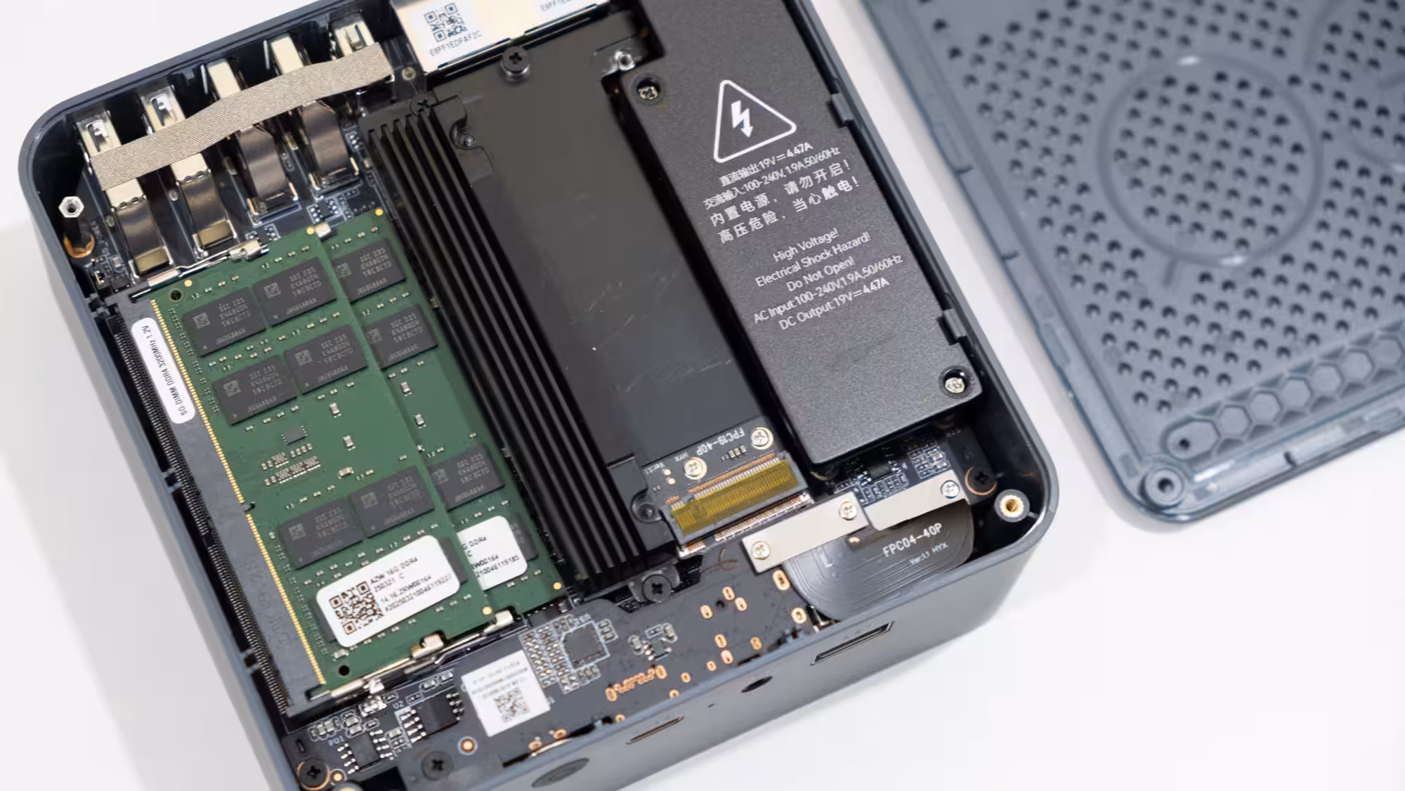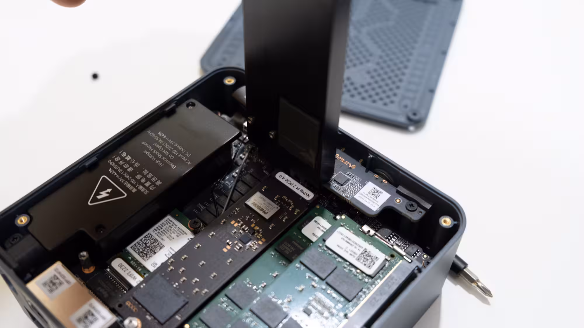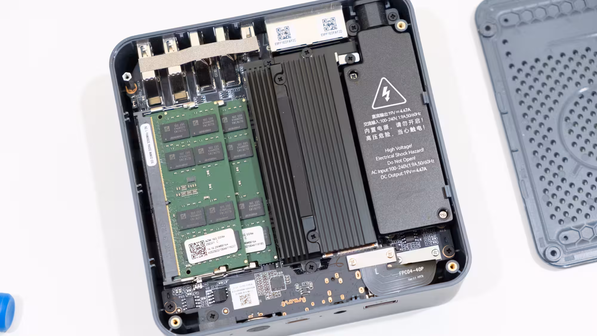 También se puede ver dos ranursa SO-DIMM para DDR4-3200 de 1.2 V. Quitando tres tornillos en un disipador este saldrá y dejará ver una ranura M.2 2280. Quitando otro disipador, con cuidado por un cable que tiene, dejará ver la unidad PCIe 4.0 ×4 que va incluida en esta mini-PC. También se verá la tarjeta combo wifi más Bluetooth que integra el equipo.
