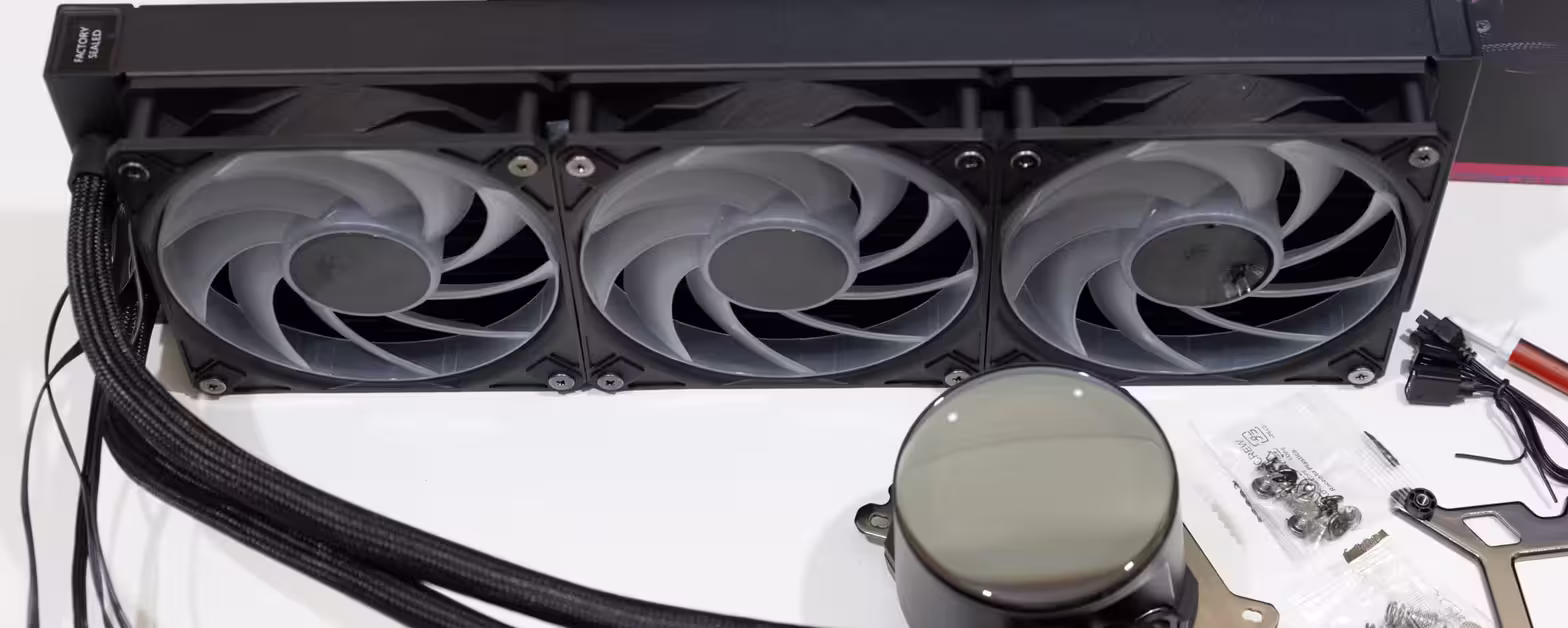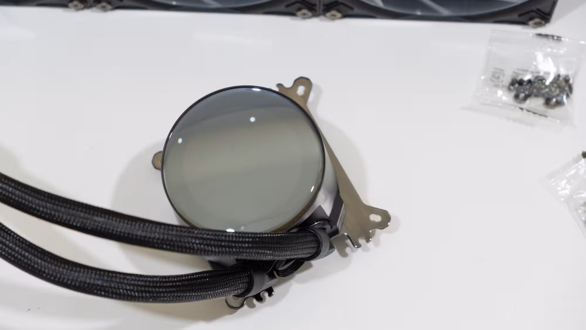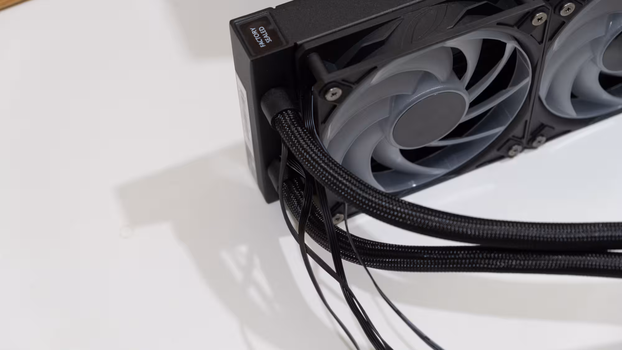 Los cables desde el bloque de agua al radiador va por debajo de las fundas de los tubos. Se notan de mucha calidad, además que los tubos tienen en torno a 400 mm de longitud. El resto de cosas incluidas en la caja son una pequeña jeringa de pasta térmica, un retenedor para los zócalos de Intel, la tornillería para la instalación en zócalos LGA 1700/1851 y AM4/AM5, un cable bifurcador del que hablaré en un momento, y un embellecedor para el bloque de agua una vez esté montado.