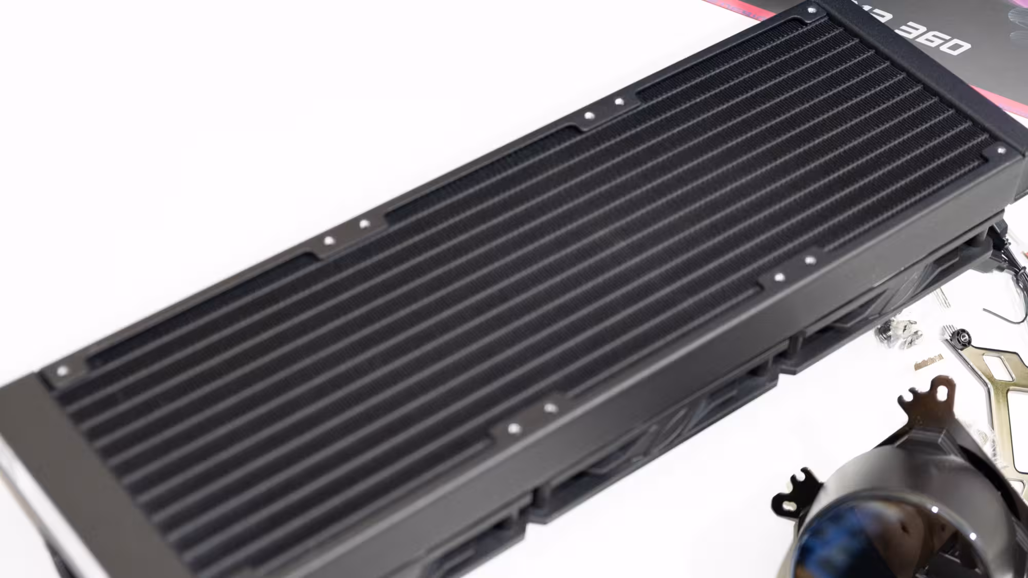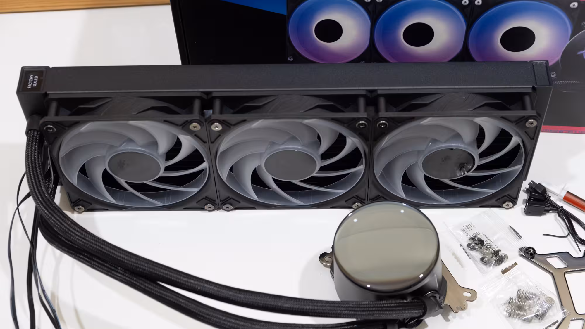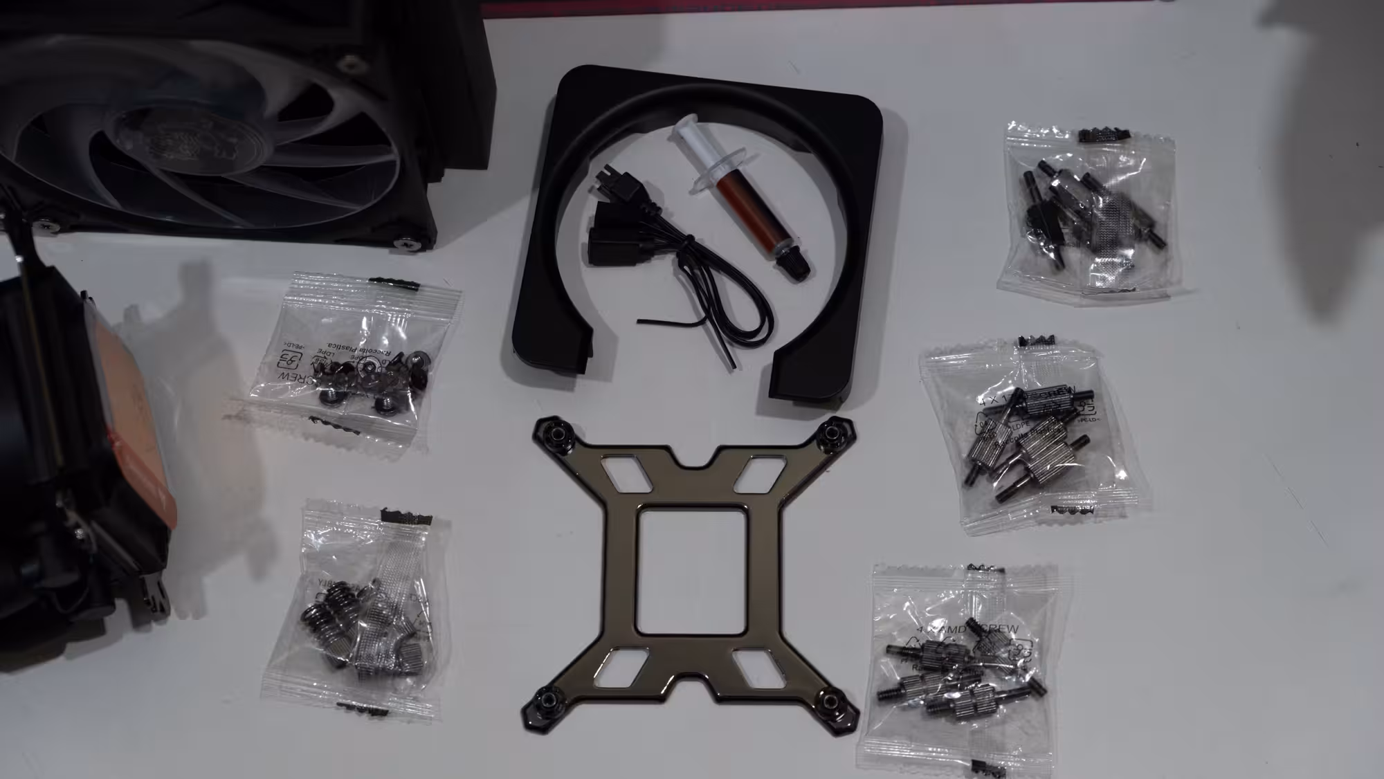 Los cables desde el bloque de agua al radiador va por debajo de las fundas de los tubos. Se notan de mucha calidad, además que los tubos tienen en torno a 400 mm de longitud. El resto de cosas incluidas en la caja son una pequeña jeringa de pasta térmica, un retenedor para los zócalos de Intel, la tornillería para la instalación en zócalos LGA 1700/1851 y AM4/AM5, un cable bifurcador del que hablaré en un momento, y un embellecedor para el bloque de agua una vez esté montado.