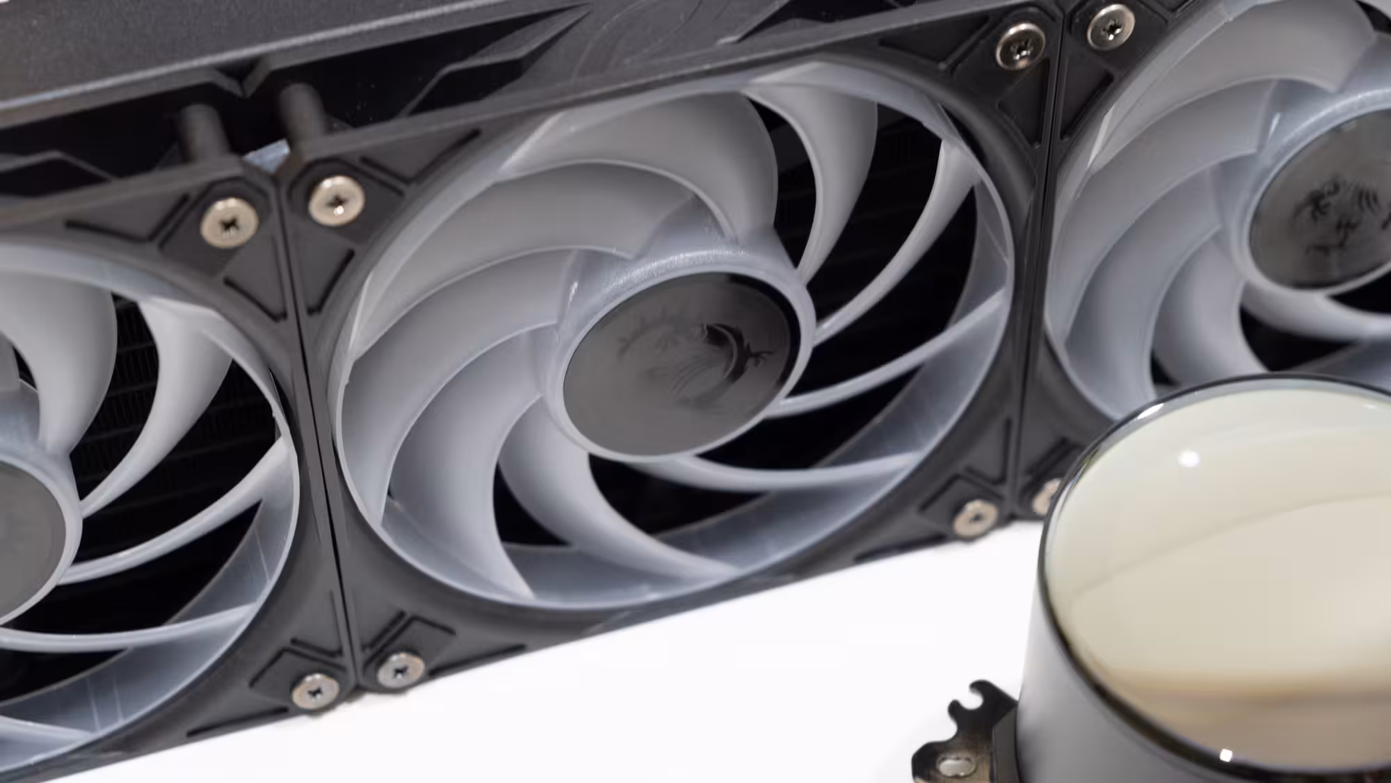 Los ventiladores son tres CycloBlade 9 de 120 mm × 120 mm × 25 mm, por lo que el grosor total es de unos 52 mm, y no creo que dé tampoco problemas de montaje porque es lo estándar para una RLI. Los ventiladores tienen anillo, que es simplemente que las aspas están unidas por un anillo para concentrar mejor el caudal de aire y que este se ejerza de manera más efectiva a través del radiador de aluminio. Tienen un caudal máximo de 117.06 m3/h (68.898 CFM), y funcionan entre las 500 y 2050 r. p. m.