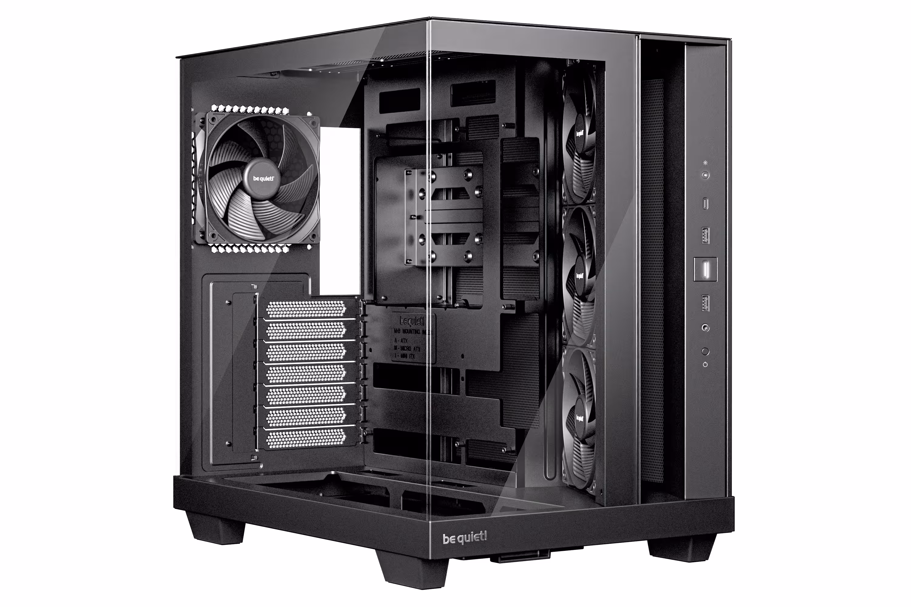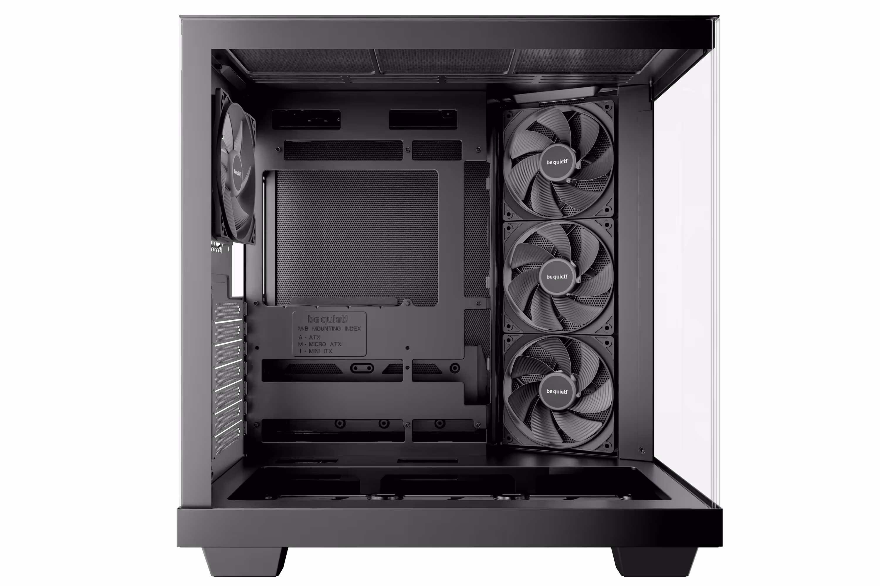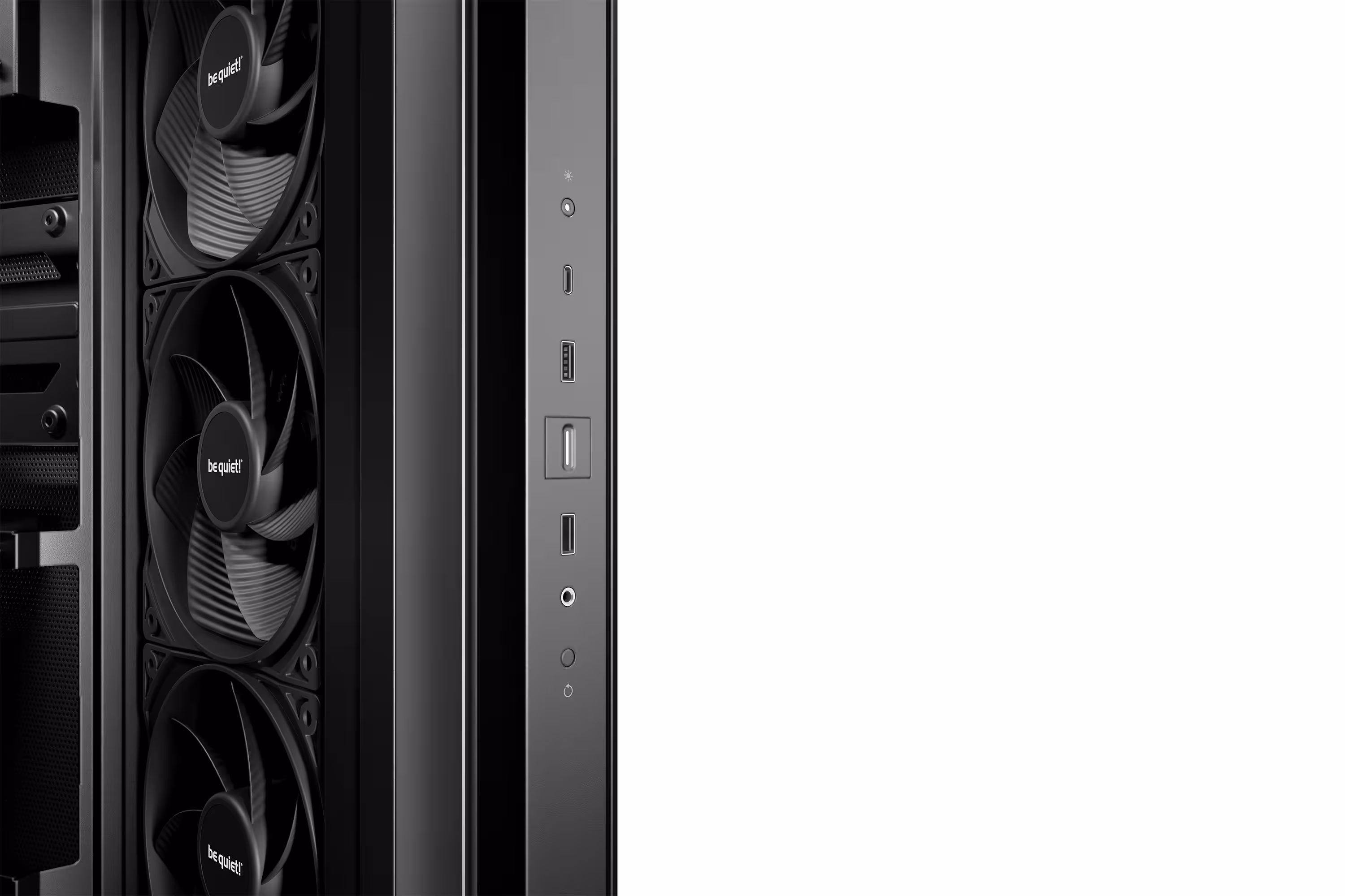 Hay espacio para tres ventiladores de 120 mm o dos de 140 mm en la parte superior, tres de 120 mm en el lateral derecho, uno de 120/140 mm en la parte trasera, y tres de 120 mm en la inferior. Se vende con cuatro ventiladores Pure Wings 3 PWM de 120 mm preinstalados, siendo tres de ellos de diseño invertido para que queden mejor en el lateral derecho.