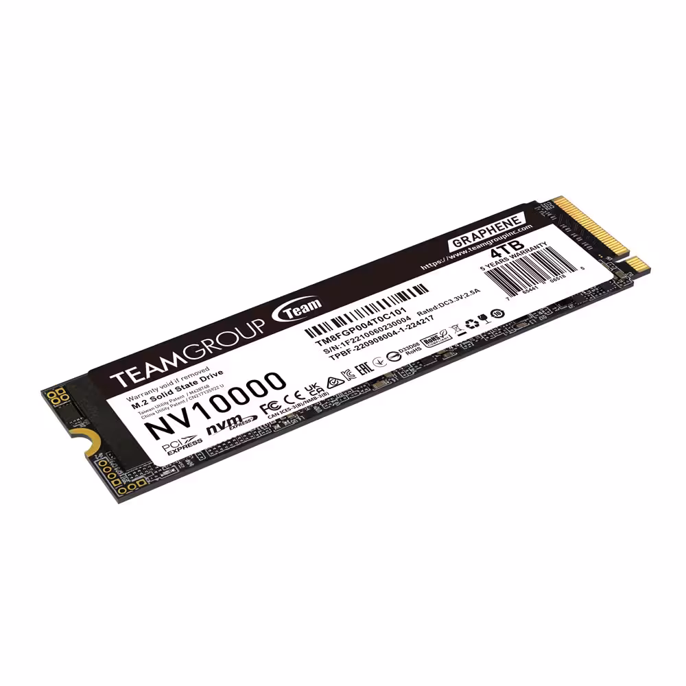 Team Group ha presentado la serie NV10000 de unidades de estado sólido (SSD) incluirá modelos de 1 TB, 2 TB y 4 TB de capacidad. Se venden en formato M.2 2280 y cuentan con una interfaz PCIe 5.0 ×4 y un protocolo NVMe 2.0. No disponen de DRAM de búfer, lo cual lastrara el rendimiento general, pero incluye una lámina de grafeno para mejorar la dispersión del calor. Integra chips de NAND 3D de tipo TLC.