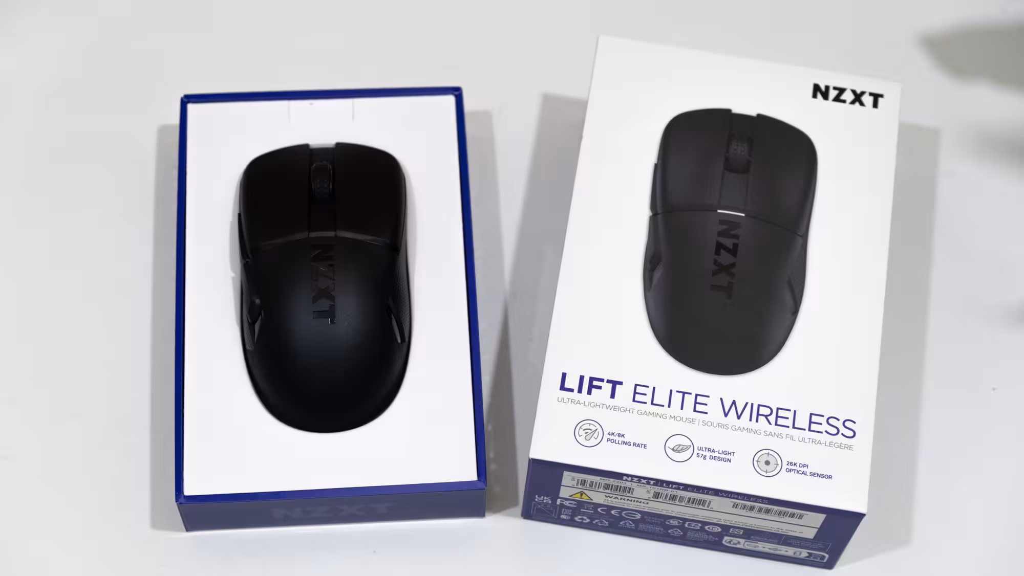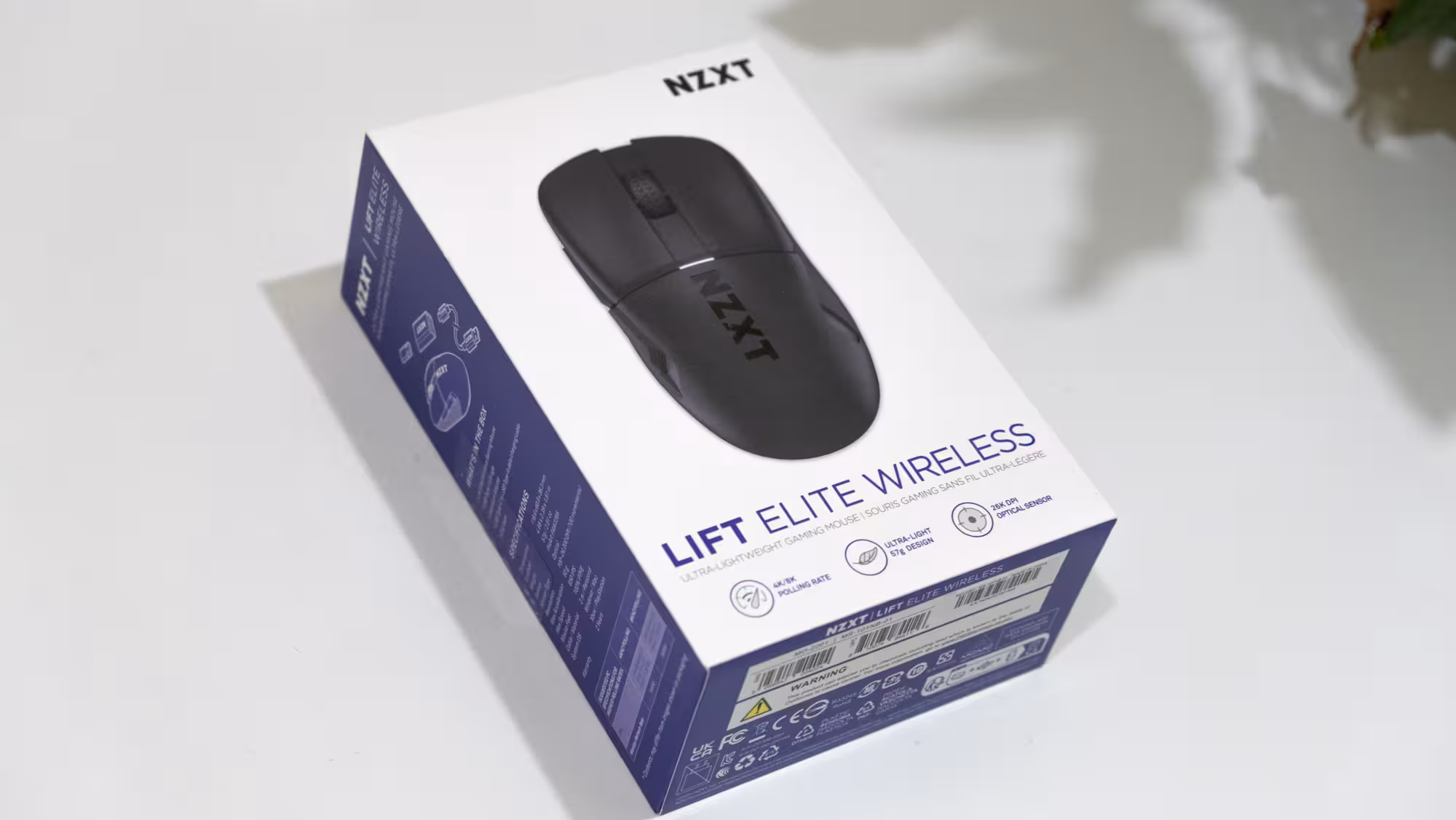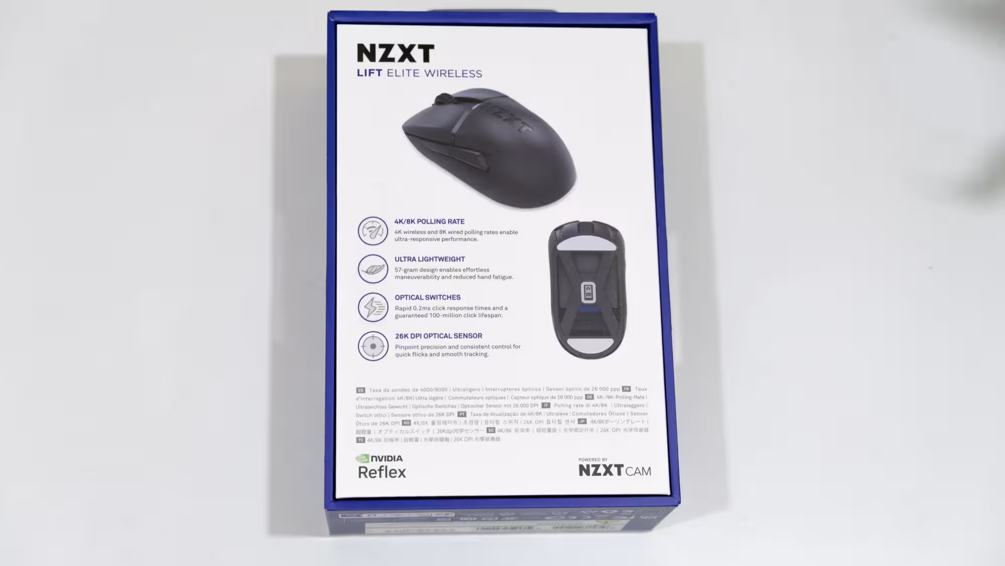 El Lift Elite Wireless de NZXT llega en una pequeña caja blanca y morada destacando en su portada el sondeo a 4000/8000 Hz, su bajo peso de 57 g, y su sensor de 26 000 PPP. En la contraportada añade que incluye interruptores ópticos en sus dos botones principales y que es compatible con Reflex de NVIDIA. En un lateral están todas las características completas incluyendo el tamaño y características del sensor.
