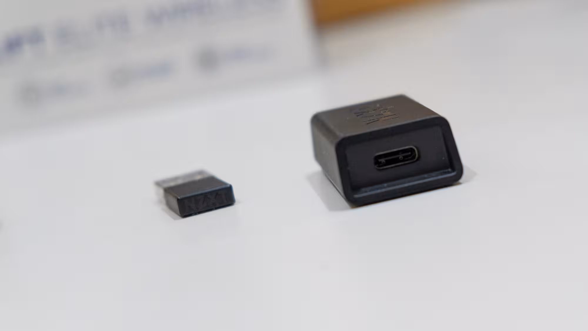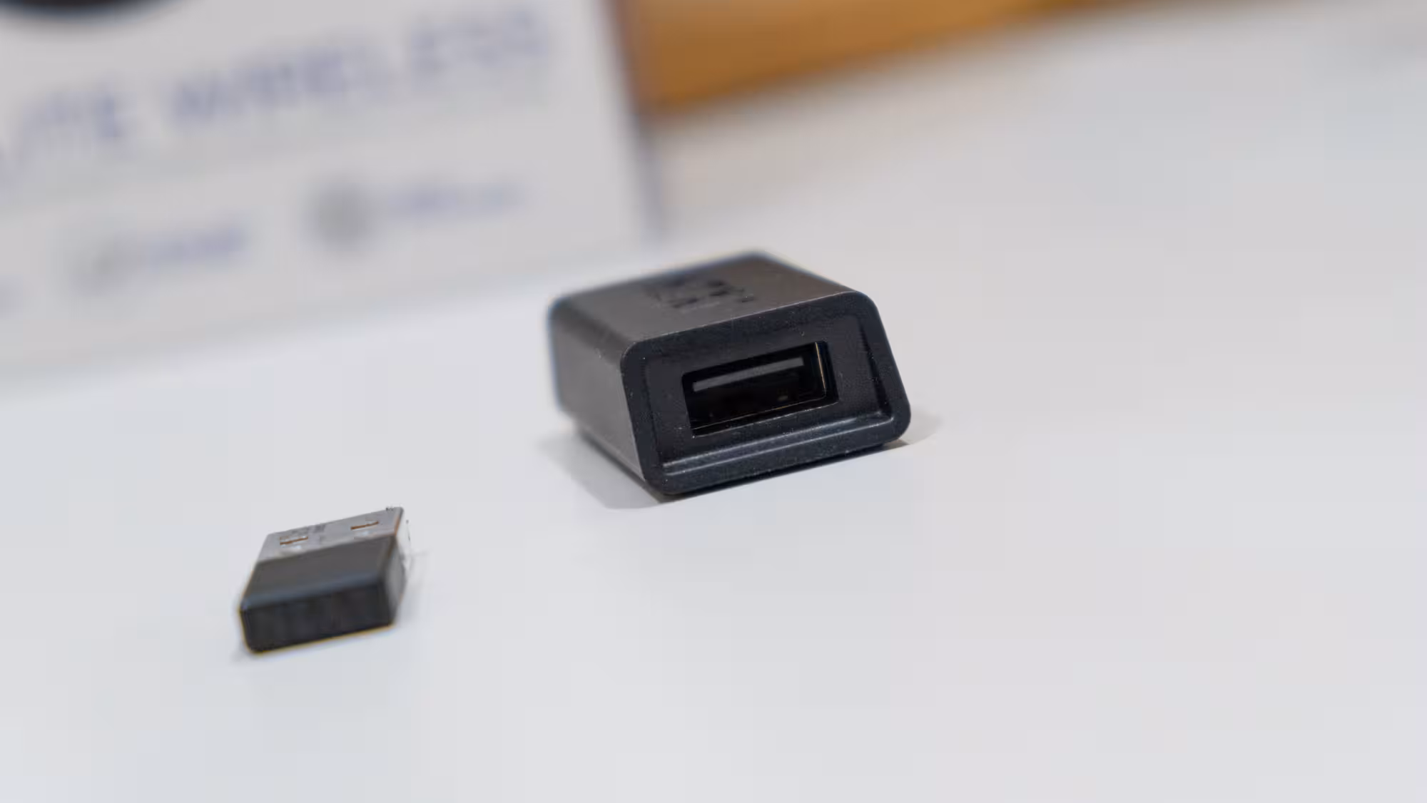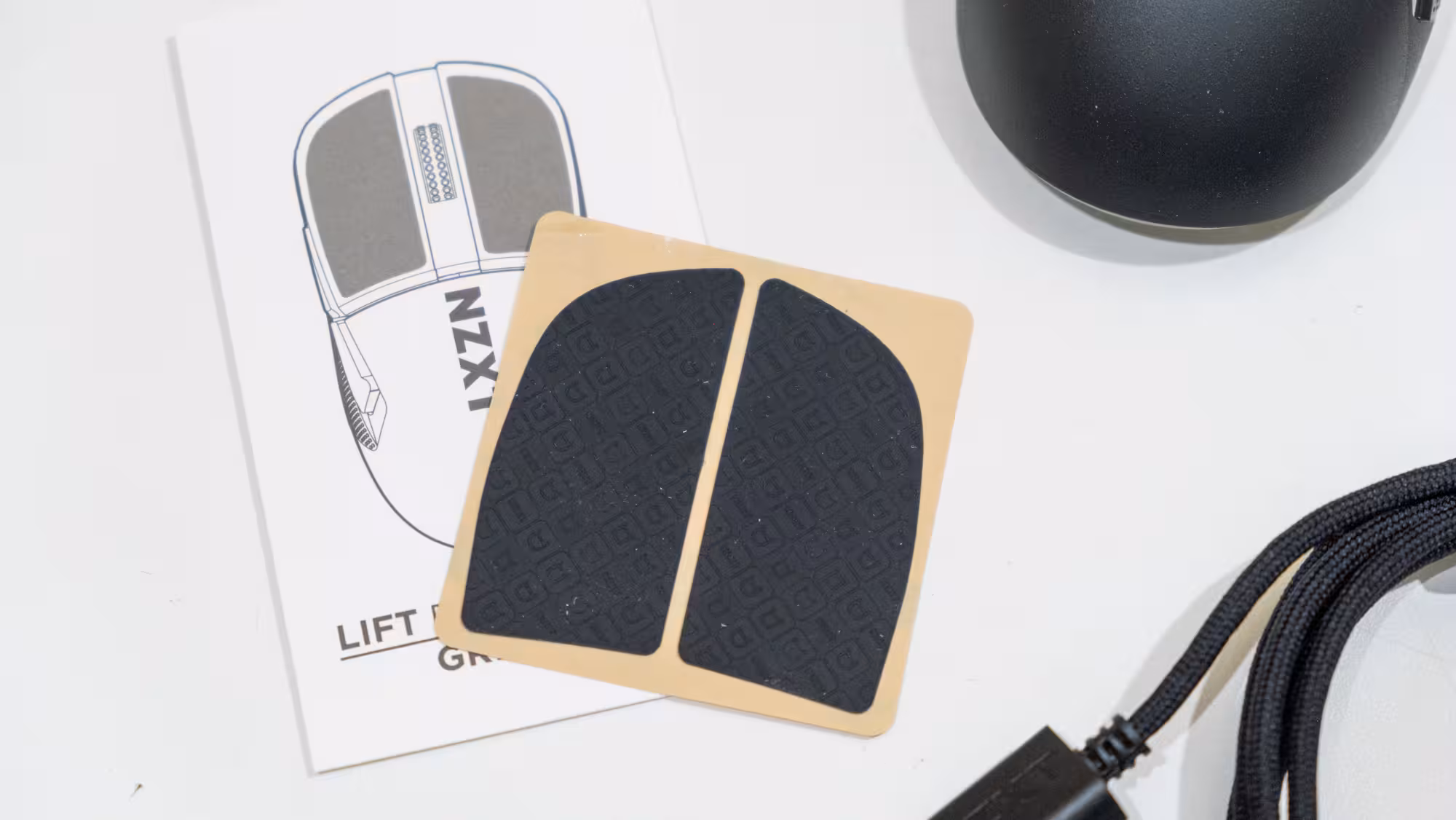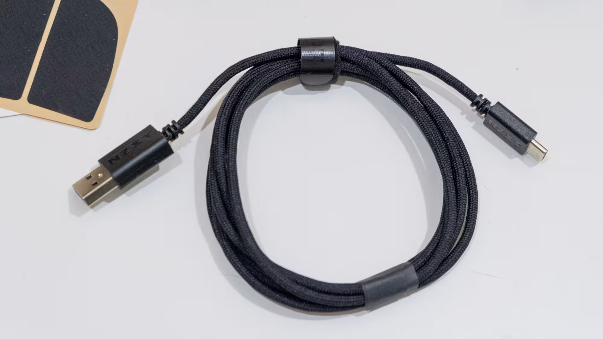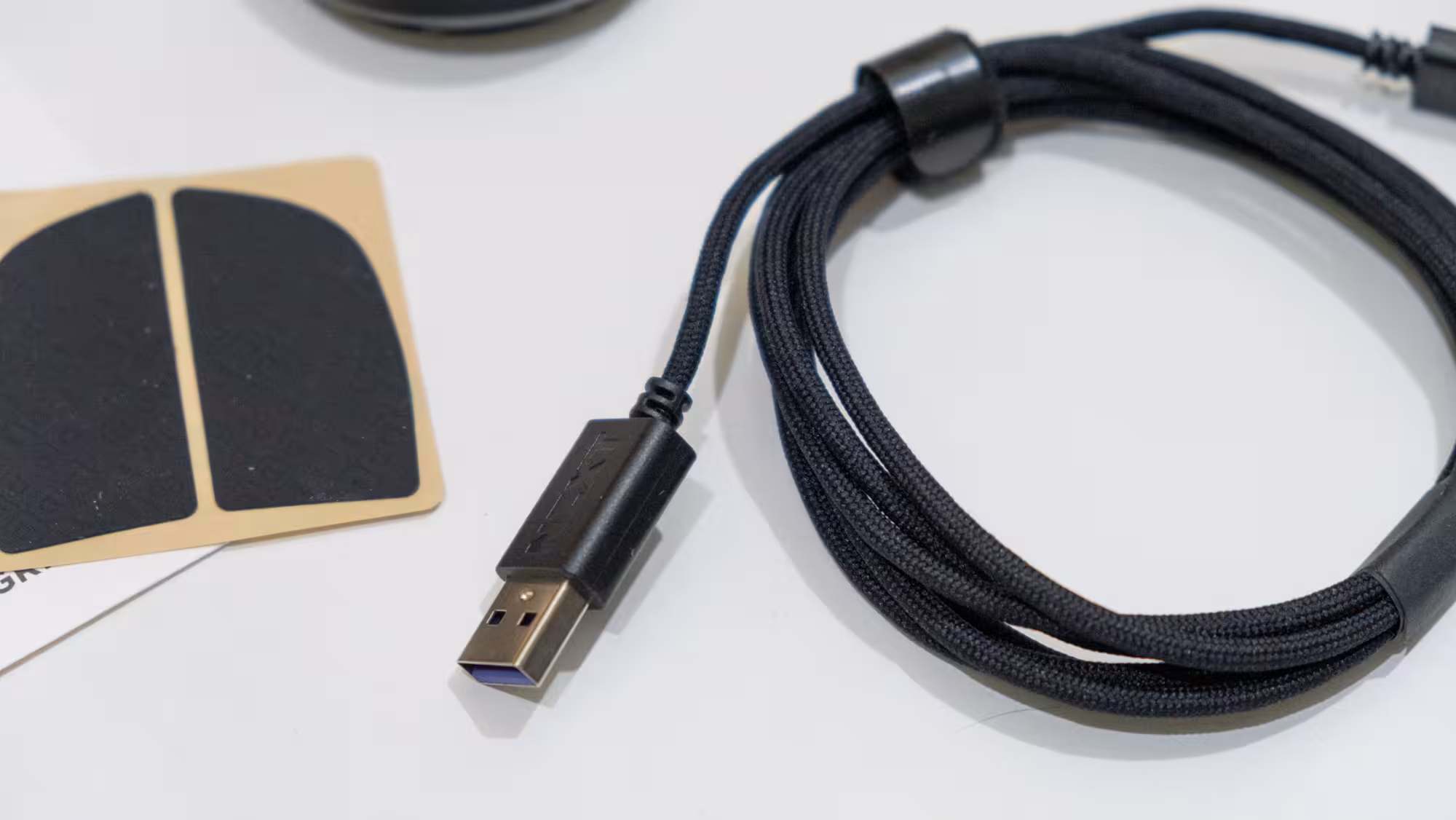Al abrir la caja se verá el ratón en una bandeja de cartón, debajo de la cual se pueden ver el receptor USB puesto en un adaptador USB-C a USB-A, junto a un cable de 2 m forrado de tela trenzada. El cable es muy flexible y de buena calidad, por lo que no debería de dar problemas a la hora de usar el ratón con él puesto. También se incluyen dos gomas adicionales para mejorar el uso de los botones principales.