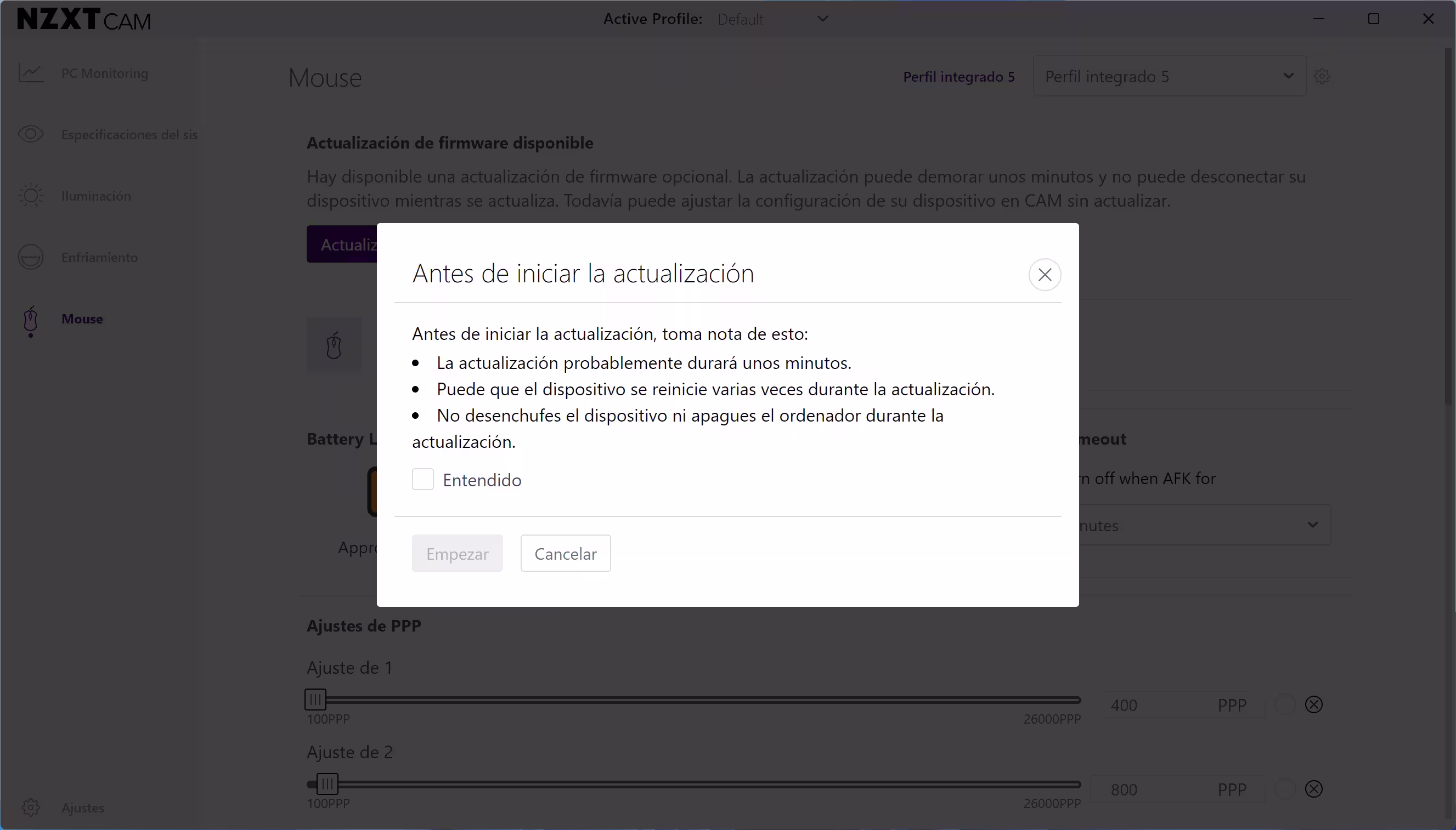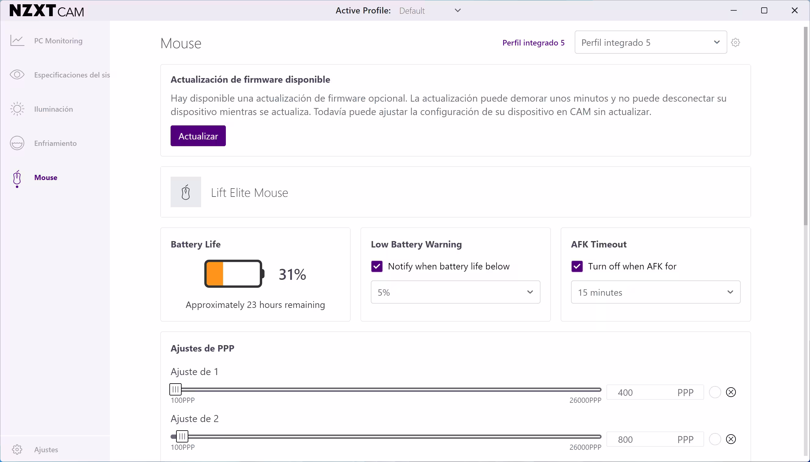 El programa de configuración del ratón es CAM, el mismo que usa NZXT para el resto de sus productos. En este caso es una mera pantalla deslizante con diversas opciones, que no son muchas, pero va al grano de lo que se podría querer modificar. También permite actualizar el ratón a un nuevo firmware, que en mi caso es lo que tuve que hacer nada más conectarlo, y es un proceso rápido.