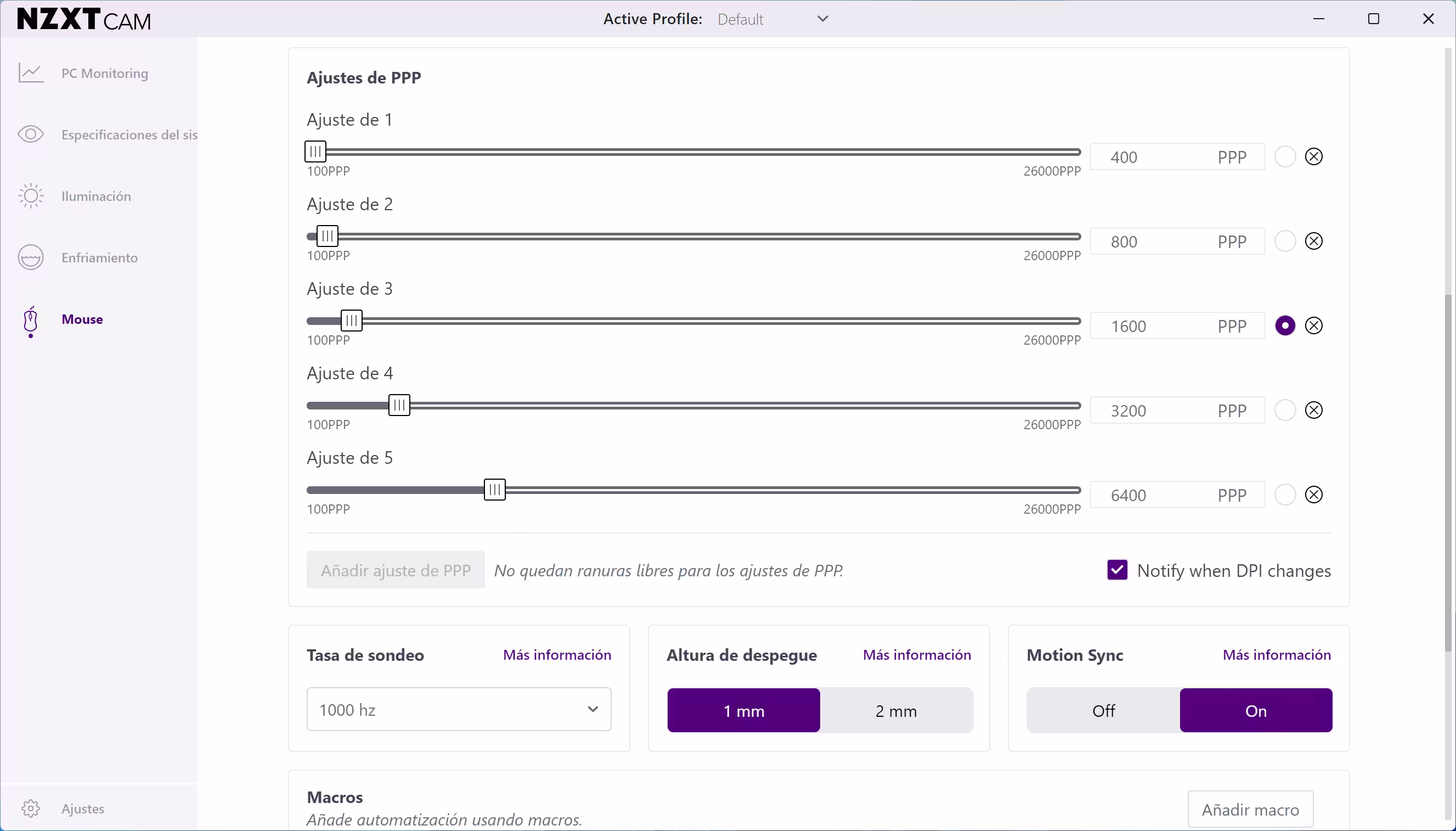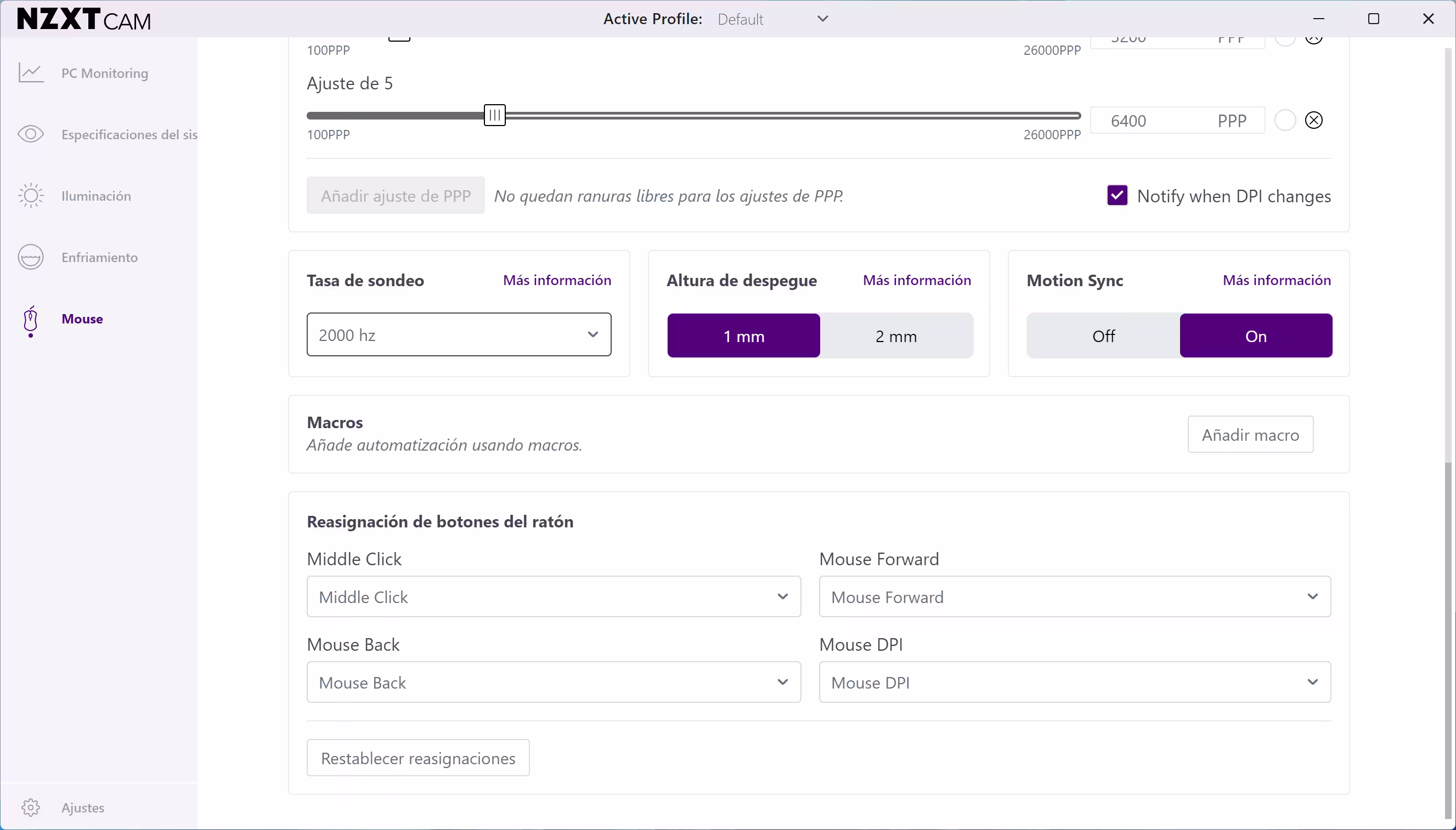 Se puede ajustar la sensibilidad del ratón hasta 8000 Hz cableado —funcionará a 4000 Hz inalámbrico—, aunque este apartado deja que desear porque se hace en incrementos de 100 PPP, aunque el sensor debería permitir incrementos menores. También se puede ajustar el porcentaje para el aviso de batería baja, o el tiempo que debe pasar para que el ratón pasa a reposo. La distancia de separación, macros o el cambio de los botones son otras opciones que aparecen.