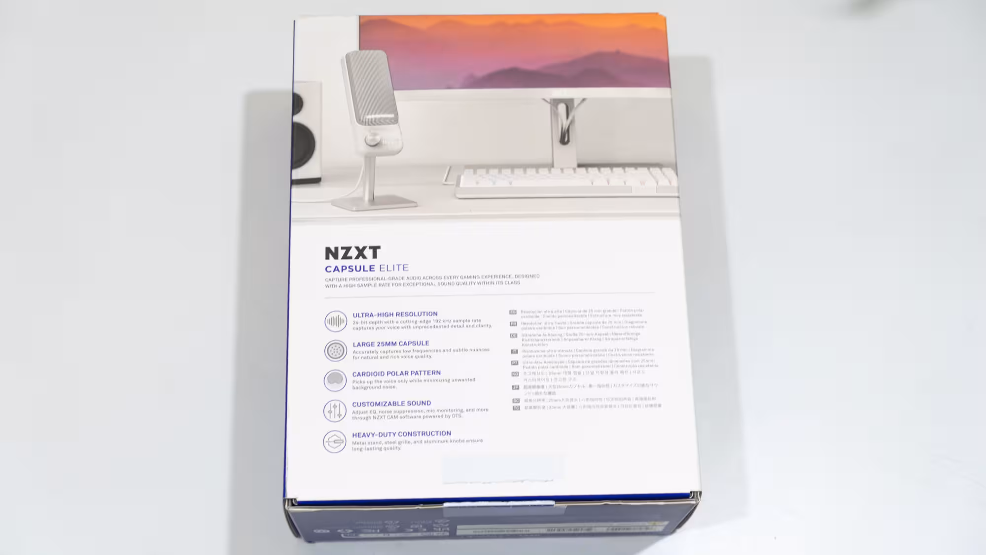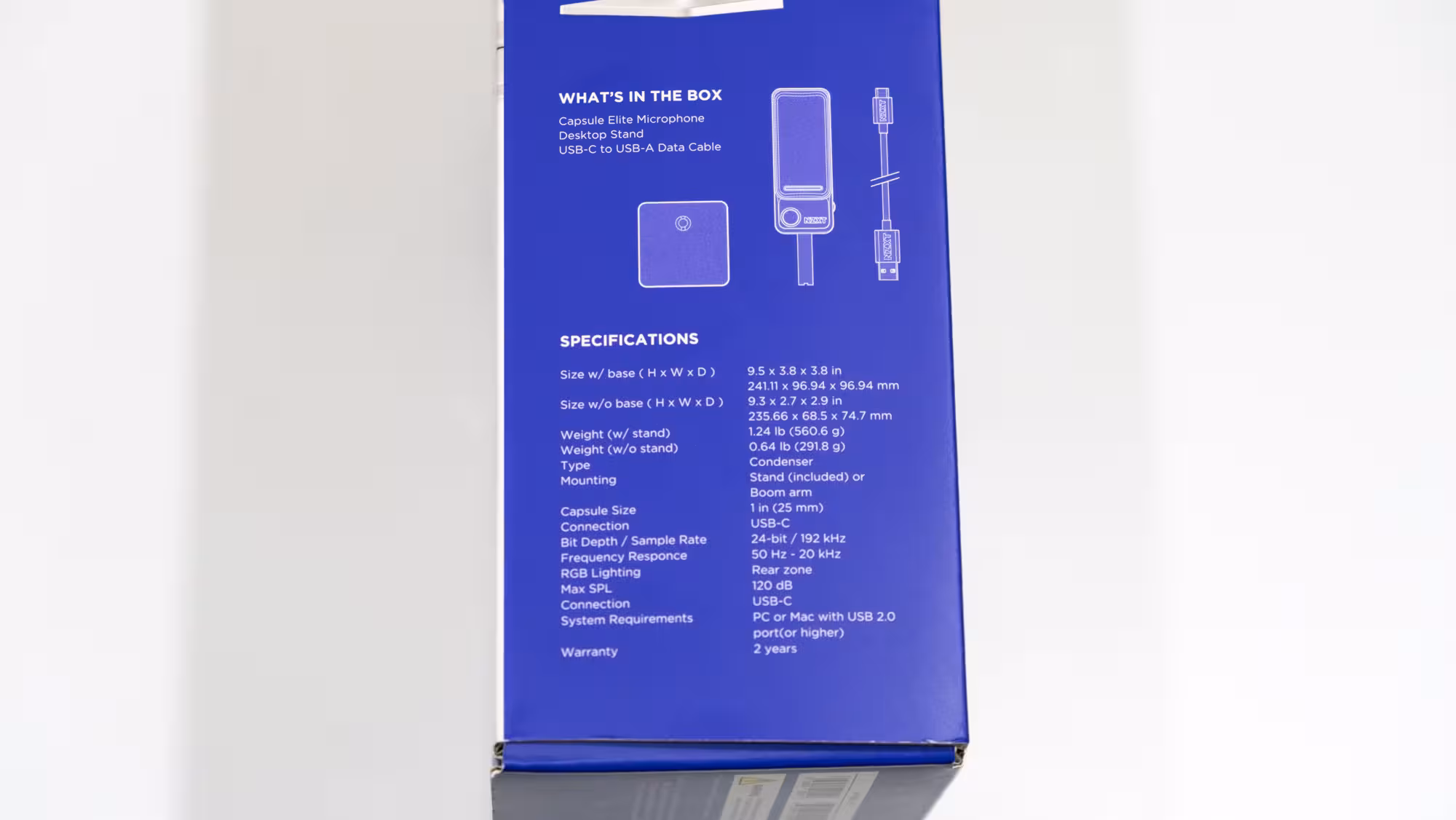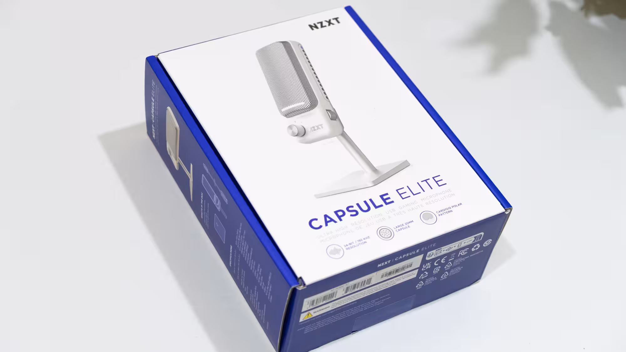 El micrófono Capsule Elite de NZXT llega en la habitual caja blanca y azul que utiliza la compañía en sus productos, dejando claras algunas características básicas como la grabación a 24 bits y 192 kHz, o su patrón de grabación cardioide. En la contraportada solo añade un par de características más, mientras que en un lateral pone las características físicas del producto y añade algún dato más que luego comentaré.