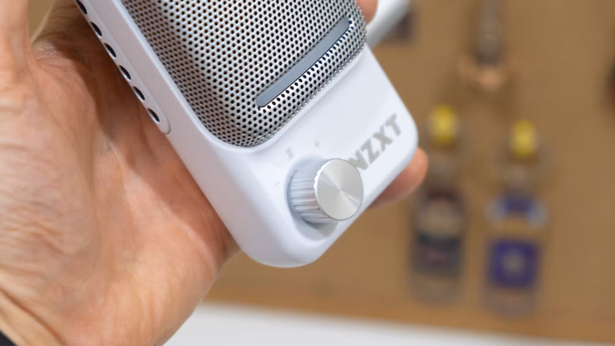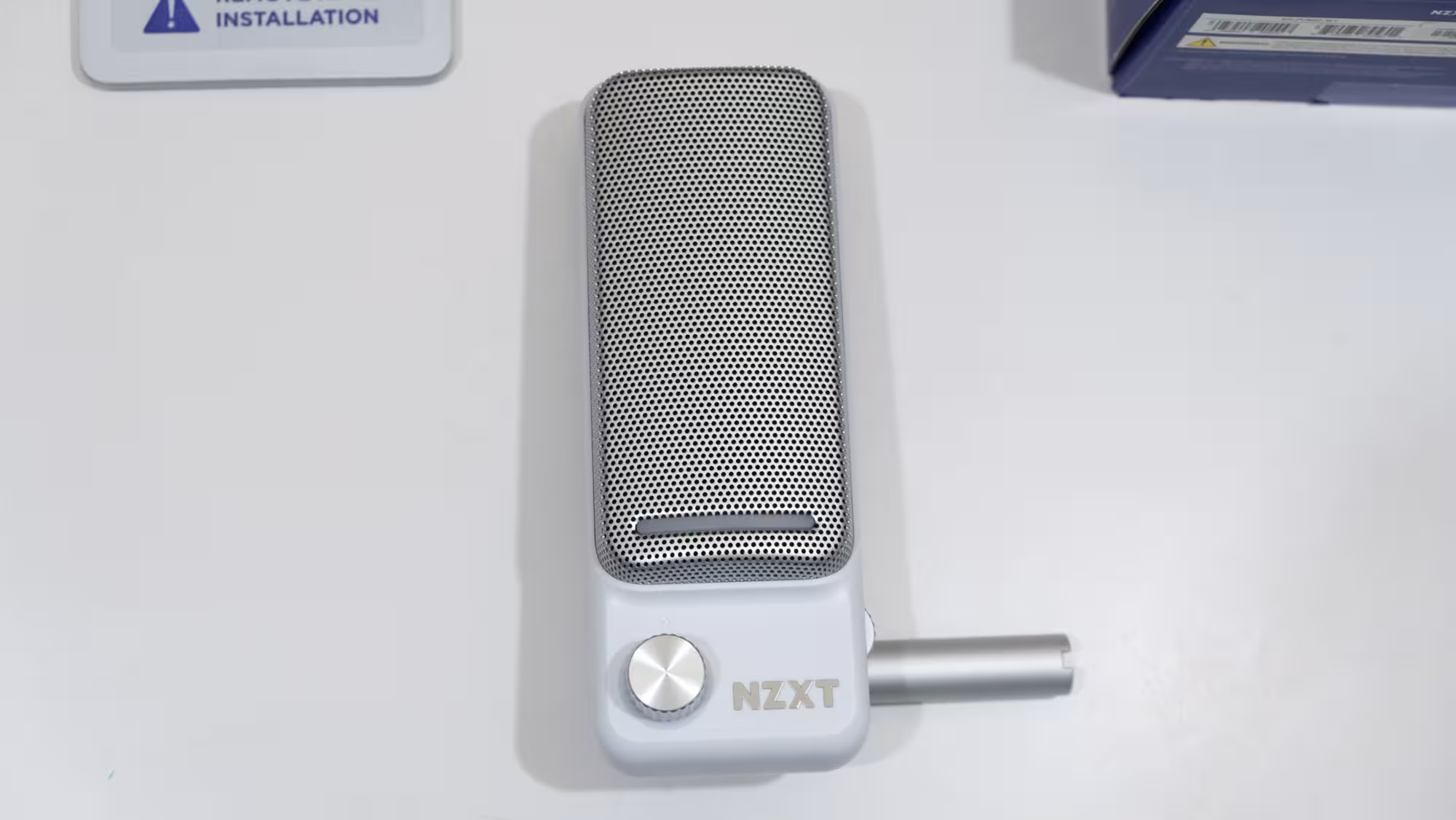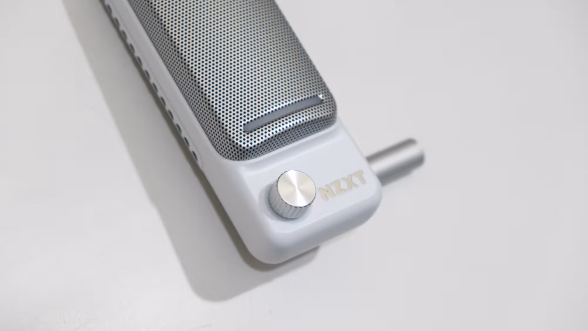 El micrófono tiene un diseño con el frontal rectangular, con una rejilla que actúa de filtro de popeo, y tiene una amplia franja led en la parte inferior. También tiene una rueda para regular la ganancia del micrófono en color plateado, y el logo de NZXT bien visible. En el lateral derecho hay una rueda de volumen para un auricular que se le conecte por la toma de 3.5 mm que hay en la parte trasera.