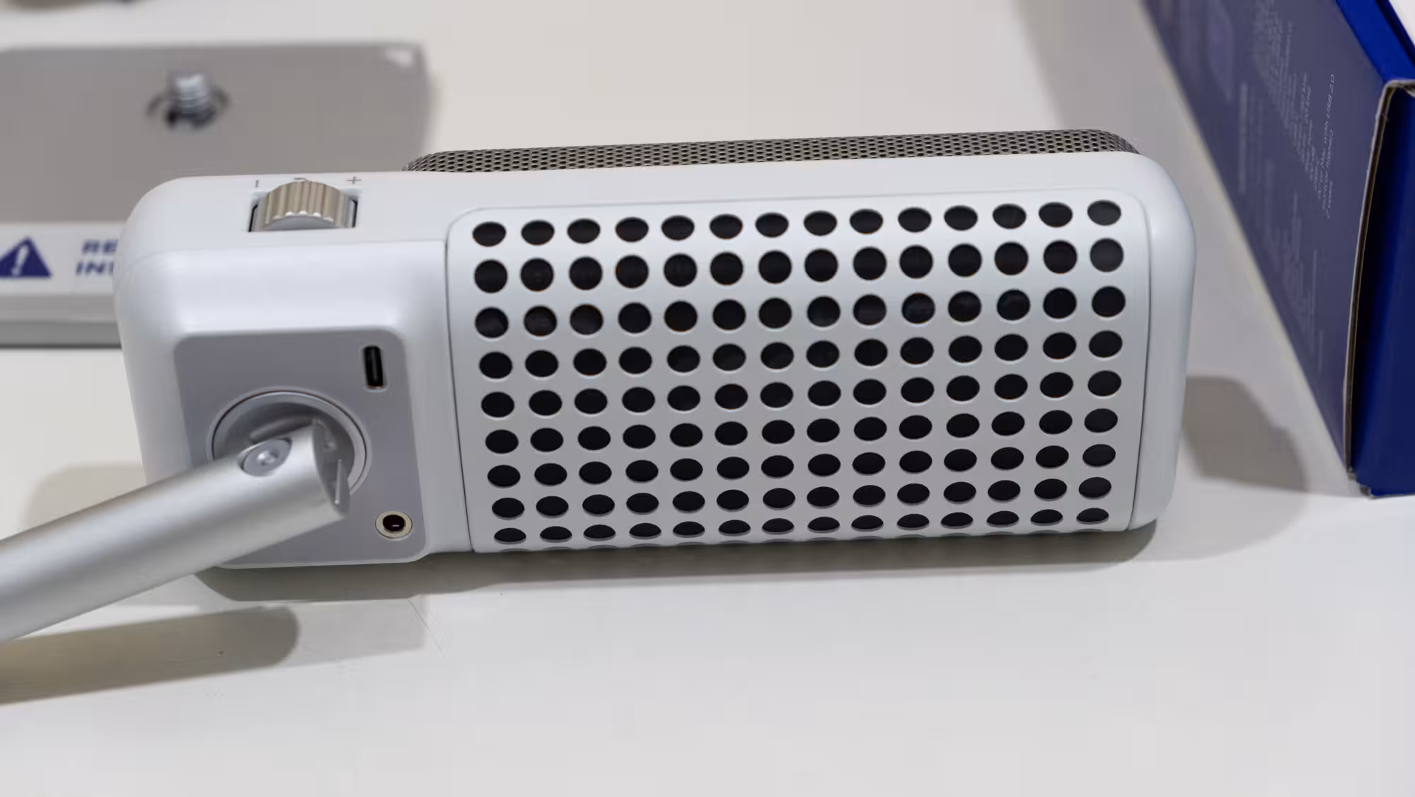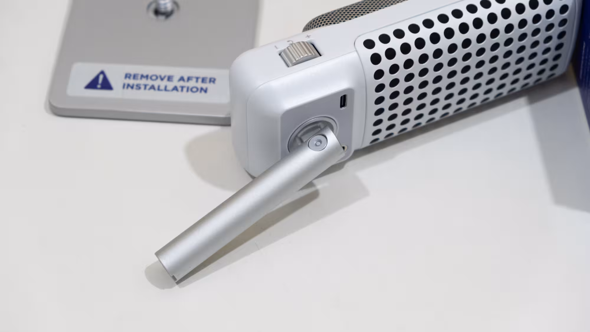 Al abrir la caja lo primero que se ve es el micrófono en una bandeja de cartón, debajo de la cual hay está la base y un cable de conexión USB-C a USB-A. El montaje del micrófono se puede hacer sin herramientas ya que en la base se incluye un tornillo moleteado que facilita conectar ambas partes. Es una rosca de 9.5 mm (3/8˝).